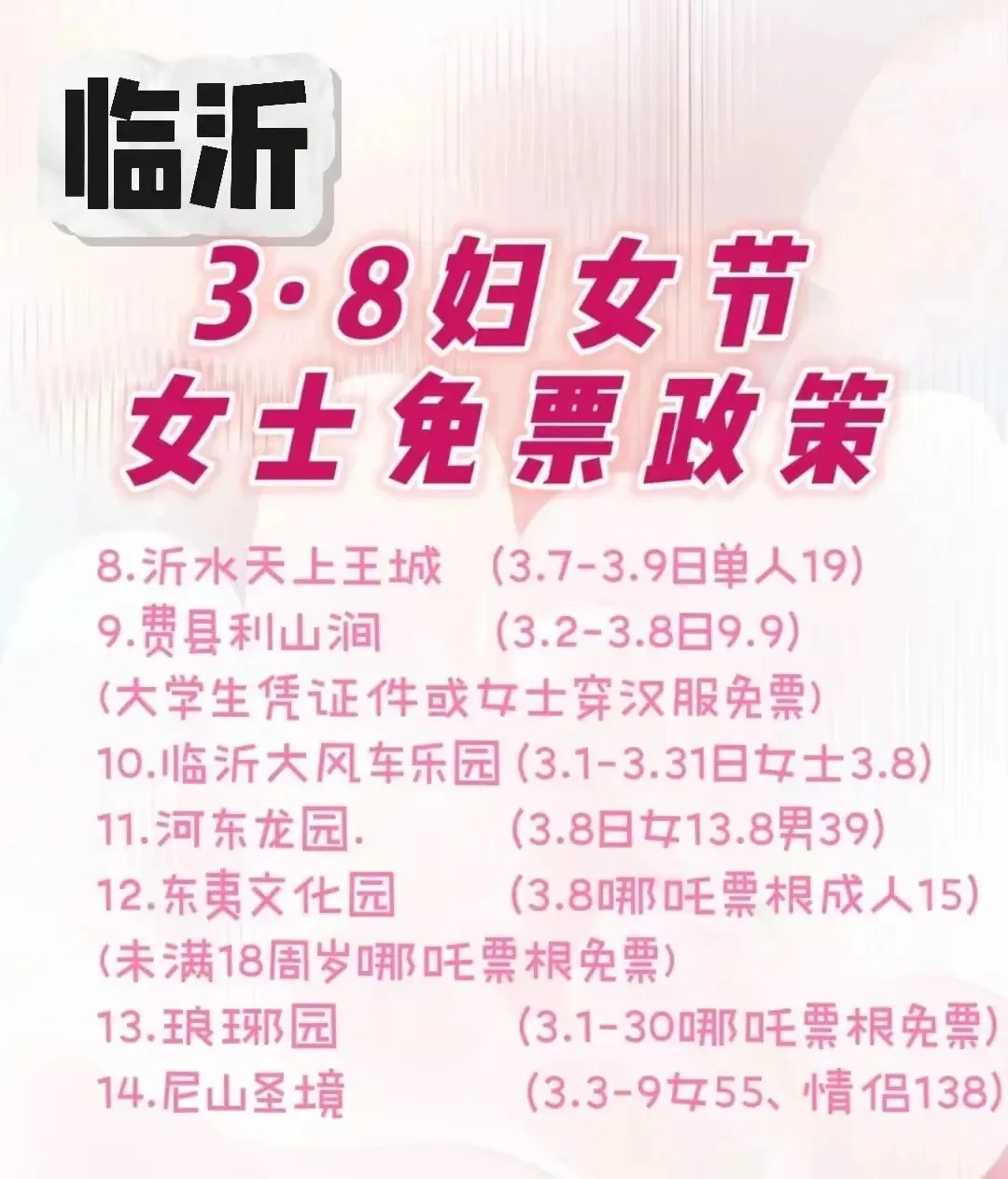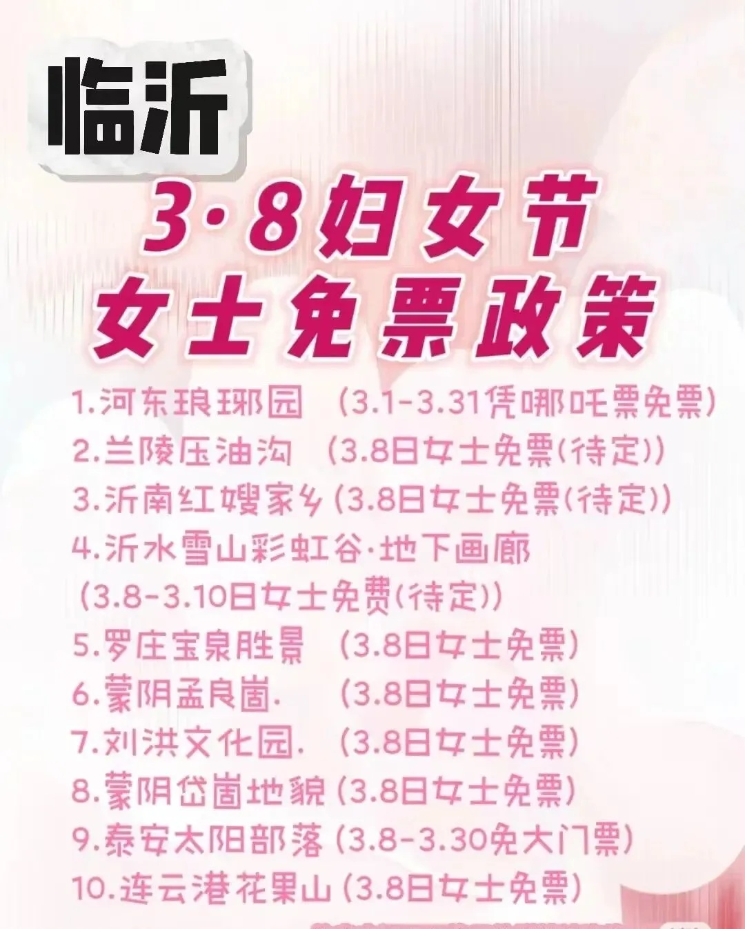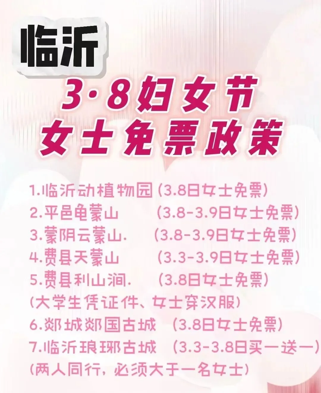 您现在的位置是:首页 > 国内旅游目的推荐 > 正文 国内旅游目的推荐 3.8妇女节【临沂】景区免票政策 admin2026年03月01日 17:23:23国内旅游目的推荐1 3.8妇女节【临沂】景区免票政策 转载请说明来源于"旅荐网",部分内容转载自网络,如有侵权请联系qlwl@foxmail.com删除 本文地址:https://www.15386.cn/post/129383.html 上一篇 关于三娘湾旅游度假区游客集散中心1#楼及2号、3号停车场集装箱商铺第二次公开招租的公告 下一篇 中东局势突变,仍有国内旅行团在中东地区旅游,多家在线旅游平台启动应急兜底保障,凌晨出发团队已紧急取消 相关文章 涉中东旅游产品,多家平台发布退改方案 【帽峰山店】广州白云区·太和镇·帽峰山旅游风景区·大型独栋轻奢别墅·落地窗·大花园·10房别墅 ��在宜昌做旅游16年,我被误会最深的工作日常 中东局势突变,仍有国内旅行团在中东地区旅游,多家在线旅游平台启动应急兜底保障,凌晨出发团队已紧急取消 关于三娘湾旅游度假区游客集散中心1#楼及2号、3号停车场集装箱商铺第二次公开招租的公告 绍兴著名景区宣布:恢复收费 阿曼区域机场提速,双重招标交通升级与旅游发展 凯撒旅游启动应急机制 保障中东地区游客安全 文化旅游学院组织学生在线观看“山河同梦:新长征豫出彩”主题思政课 记录一下旅游的记忆,古时风貌,乡村美景 发表评论 取消回复 评论列表 这篇文章还没有收到评论,赶紧来抢沙发吧~