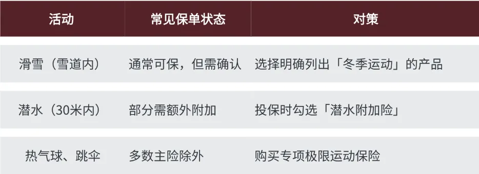 盲区3:「高风险运动」—— 滑雪、潜水、热气球,保不保?