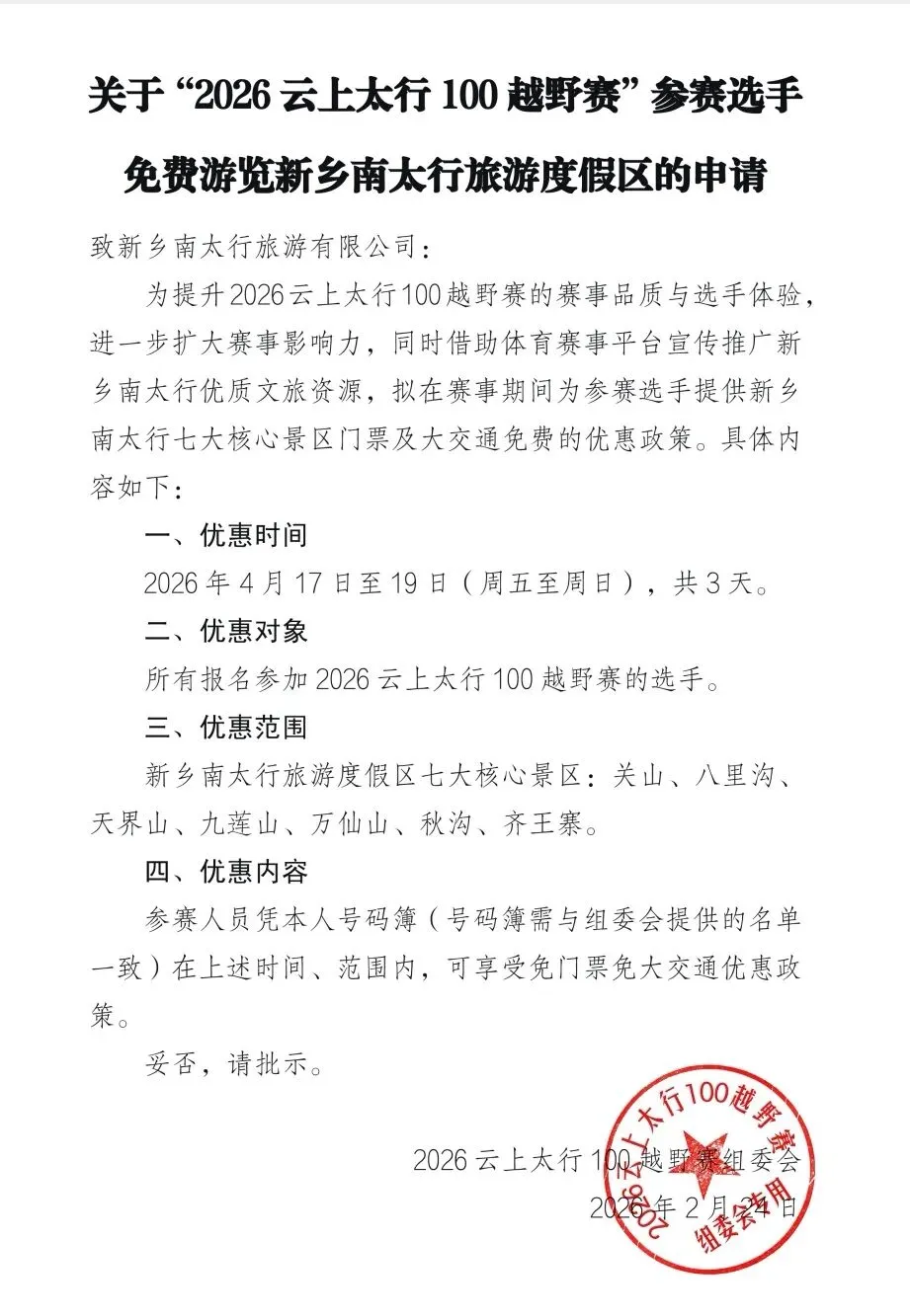 免票!五大景区随便玩!2026云上太行100越野赛选手超级福利来了