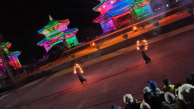 当夜幕降临,景区华灯璀璨、光影流转。绚丽灯光秀点亮夜空,震撼打铁花与火秀表演轮番登场。铁花飞溅、流光溢彩,非遗技艺与现代光影交相辉映,将节日的氛围一次次推向高潮。