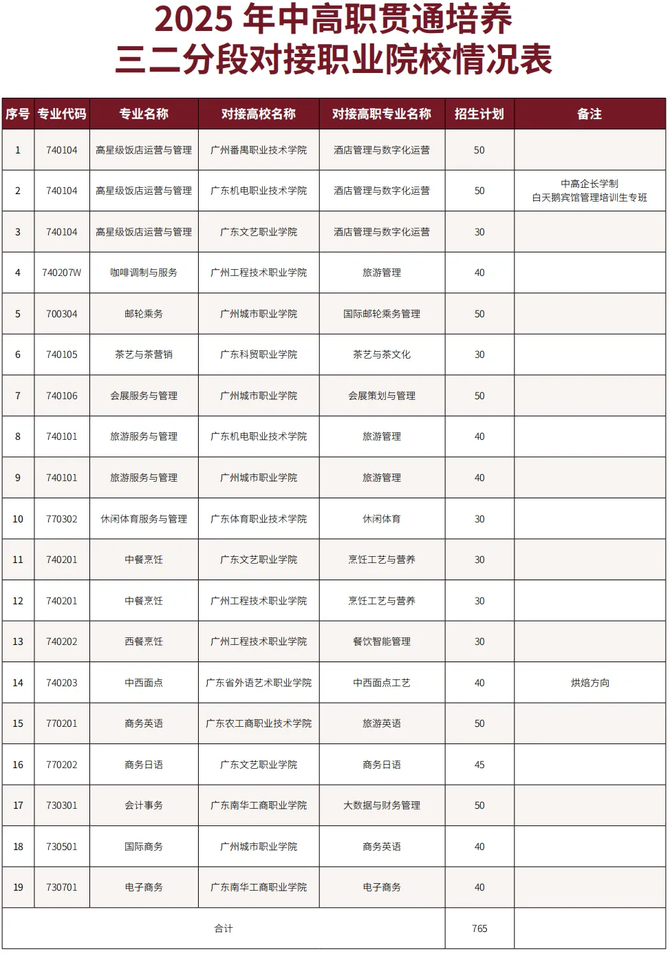 高星级饭店运营与管理等专业与广州番禺职业技术学院等高职院校签订“中高职贯通培养三二分段”合作协议,学生可以通过报考“中高职贯通培养三二分段”班的方式入读高职院校,我校每年该批次招录名额占招生总数 60% 以上。