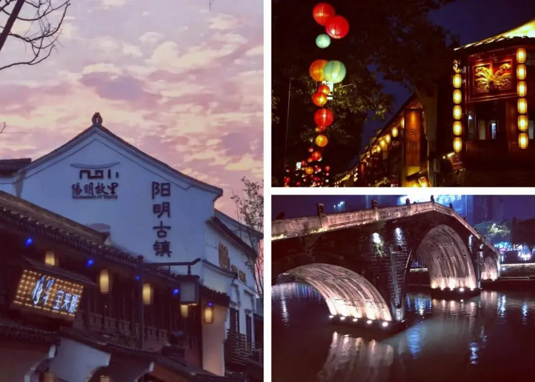 夜晚的阳明古镇灯火阑珊,姚江穿镇而过,通济桥横卧江上,两岸古建筑倒映水中,可漫步老街,感受先贤故里的文化韵味与新春余庆的温馨。