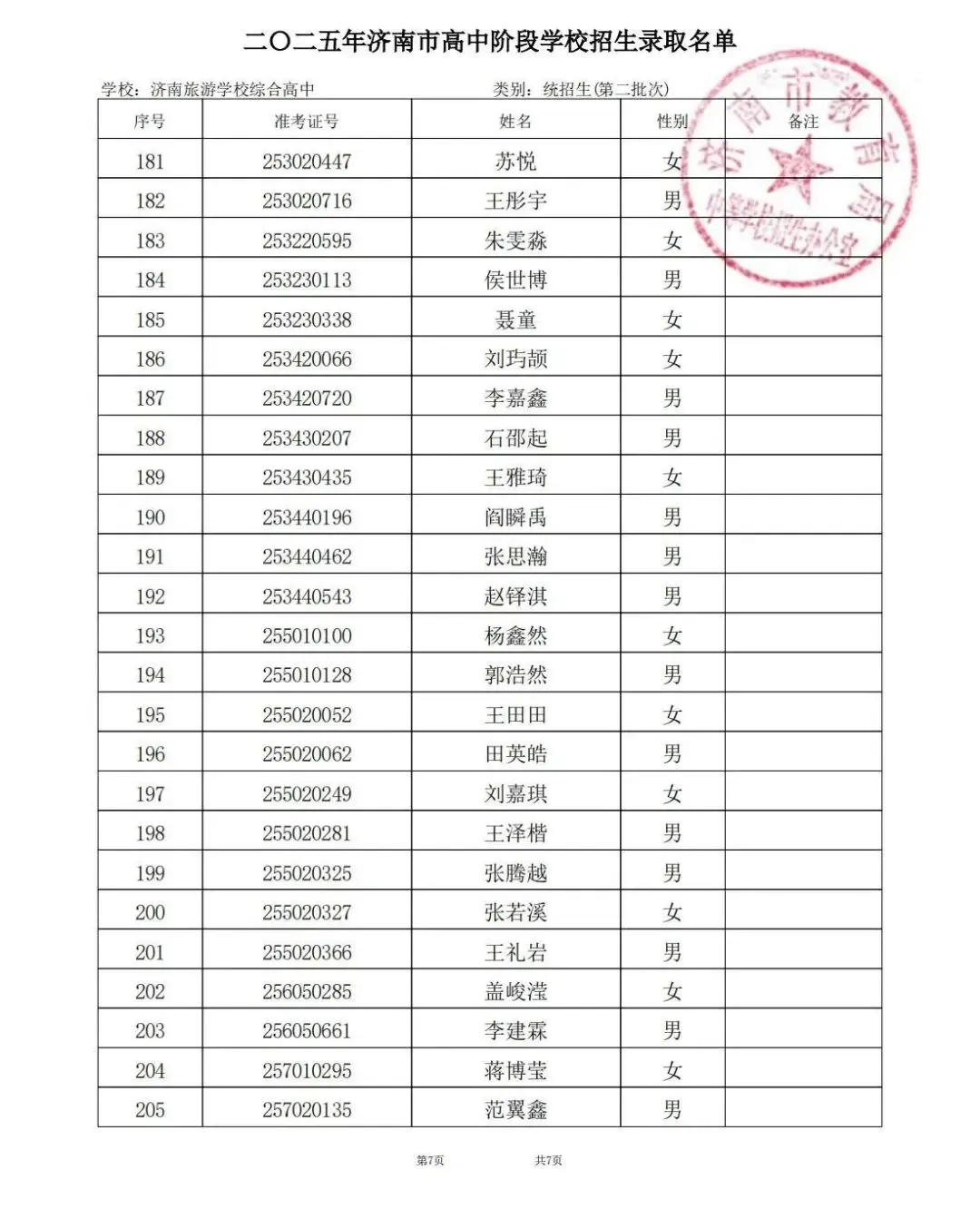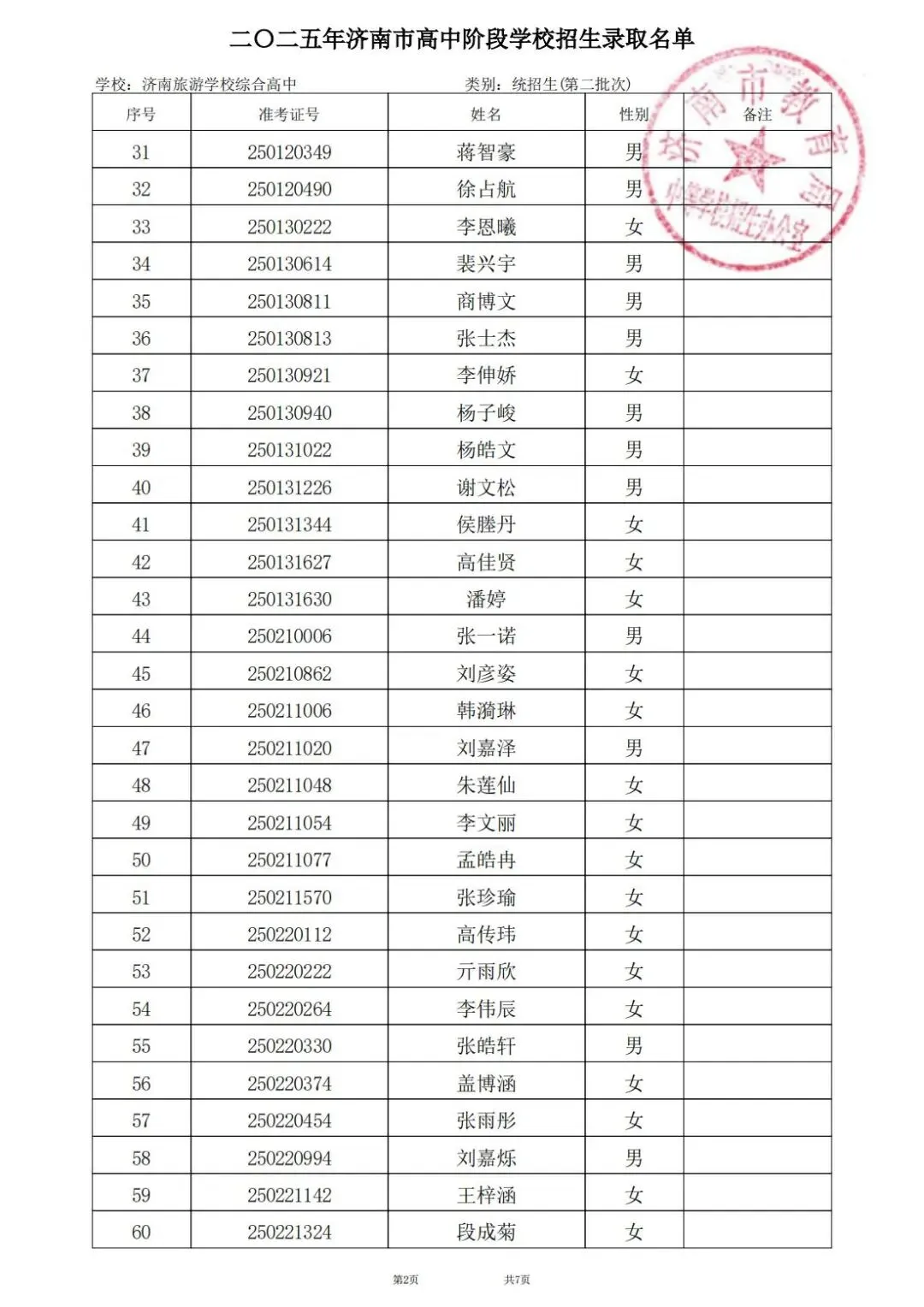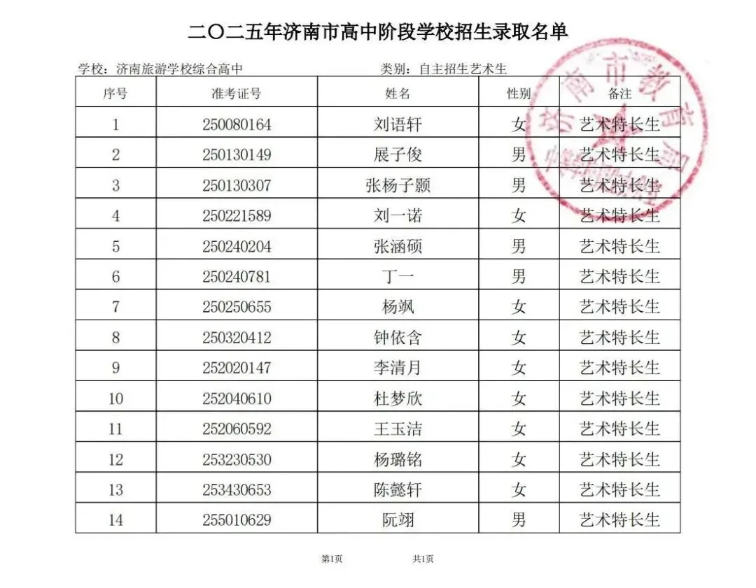 济南旅游学校2025年高中统招生(含艺体特长生)录取名单