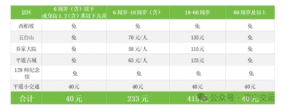 各景区门票明细