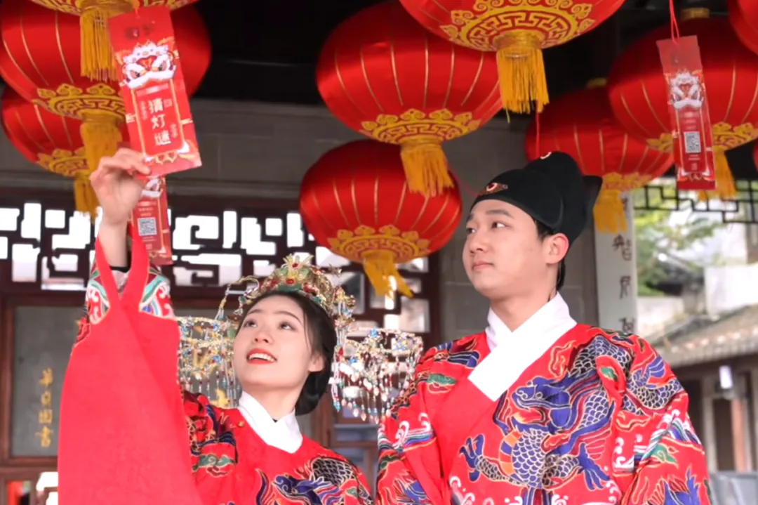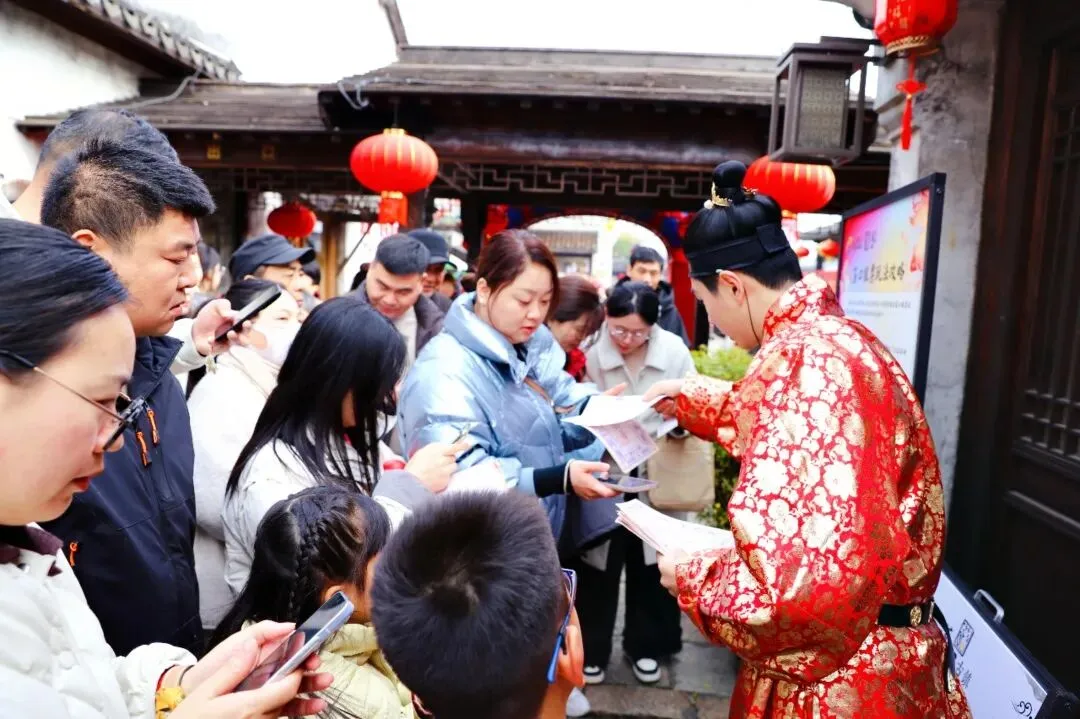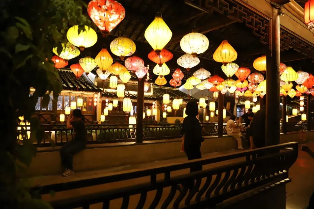 荡口古镇的元宵氛围就已拉满!我们在一得榭前精心打造了两座雅致的“灯谜亭”,悬挂着彩色灯笼与谜签;更有花颜桥长廊,也被点缀成一条流光溢彩的灯谜长廊。