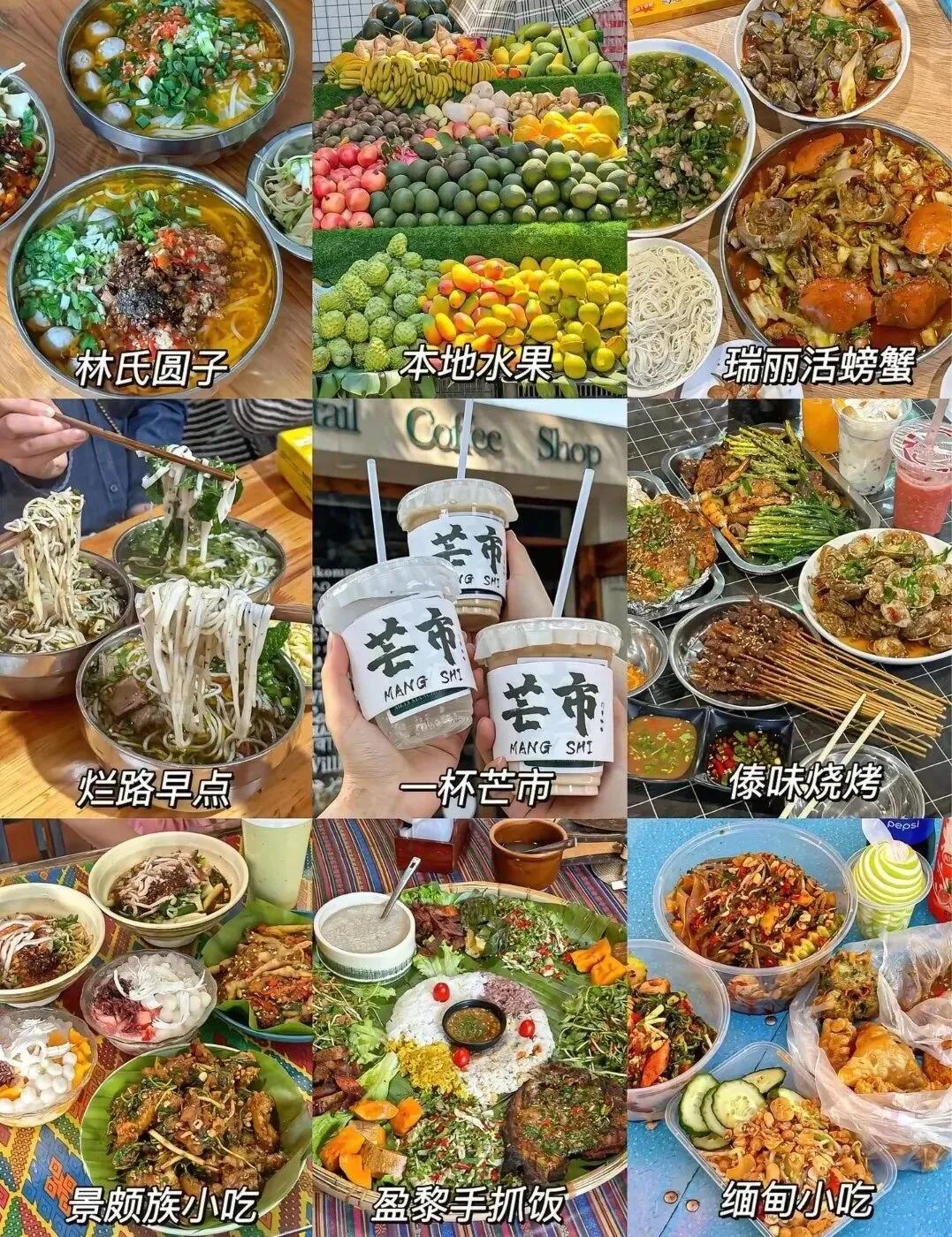 必吃:大救驾(炒饵块)、土锅子(铜锅慢煨)、稀豆粉(配烤饵块)、火瓢牛肉(香辣干锅)。 特色:和顺头脑(甜酒蛋糊配肉丝)。 必吃:撒撇(柠檬撒 / 苦撒,德宏灵魂)、傣味绿叶宴、泡鲁达、甩粑粑、德宏烧烤。 特色:牛油果奶昔、凉拌鬼鸡、各类泡菜。 必吃:香辣炒活蟹、泡鲁达、缅式咖喱 / 冬阴功汤。 特色:港式拉茶、热带水果(芒果、榴莲、山竹)。