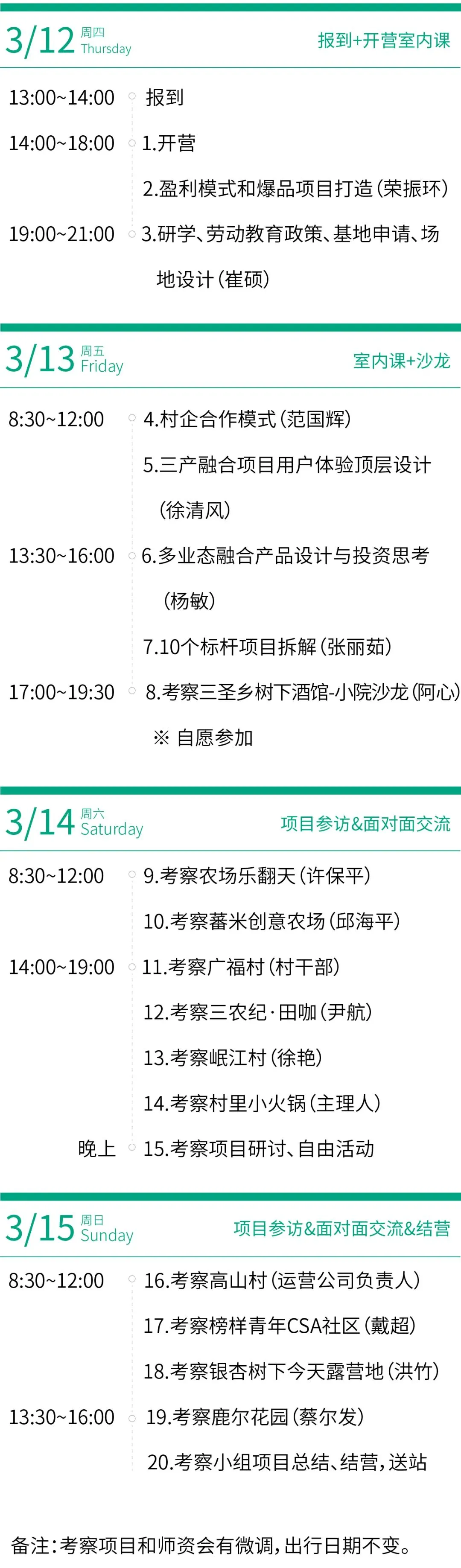 3月12-15日,采取主题授课、实地考察/调研、交流研讨等多种教学方式,选取10个乡村振兴的标杆项目,从业态上涵盖了乡村旅游、研学基地、亲子农场、美学小院、主题乐园、田园咖啡、精致露营、民宿、农家乐、文创馆等。