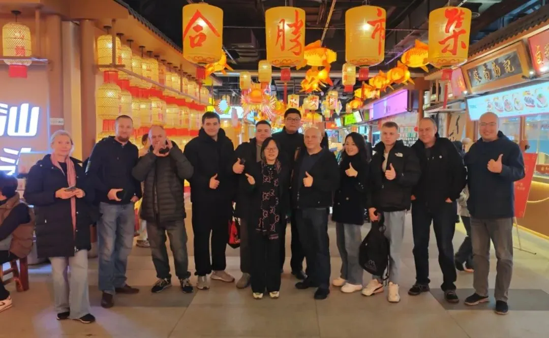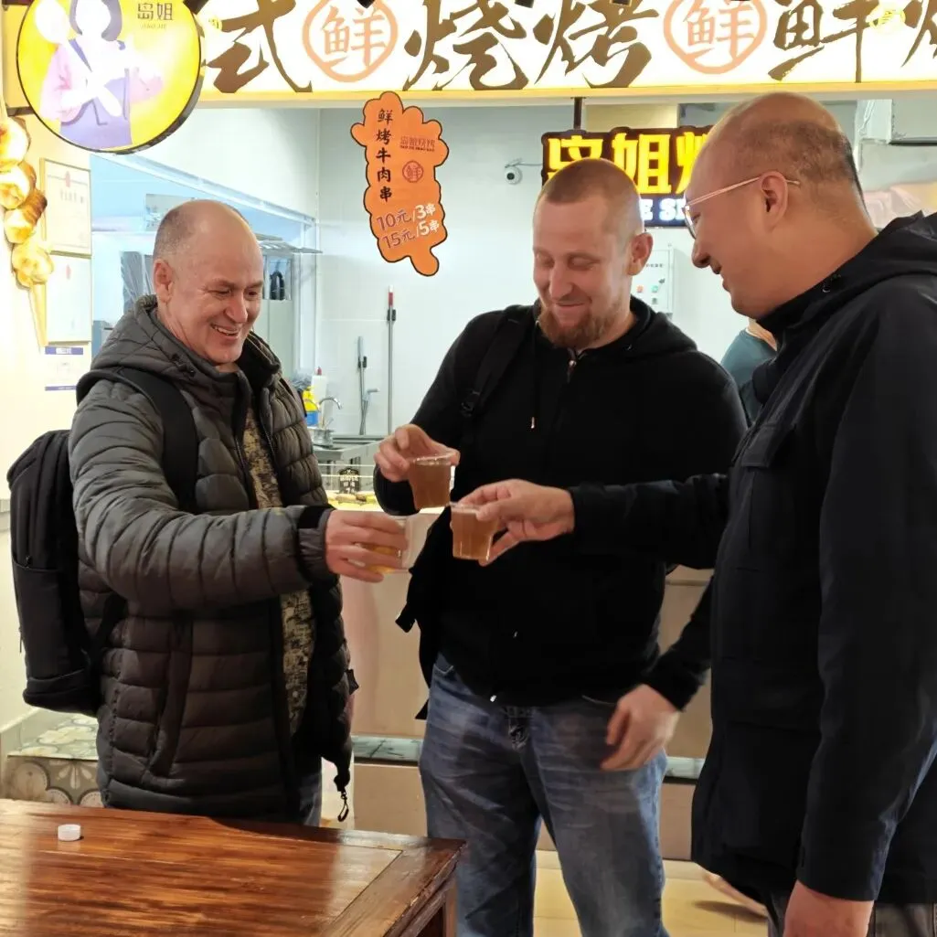 文化体验之余,一场地道的潮味盛宴正等待着船员们。汕头牛肉丸必须榜上有名,一口咬下爆汁弹牙,鲜美的肉香在口腔中迸发;刚出炉的鲜烤牛肉串滋滋冒油,撒上秘制沙茶调料,咸香回甘、越嚼越香;皮薄馅足的潮汕饺子、咸甜交织的蚝烙、鼠壳粿等特色小吃轮番登场,每一口都是纯粹的潮汕风味;清香醇厚的单丛茶解腻爽口,而真正让俄罗斯船员们“上头”的,当属潮汕的特色米酒。