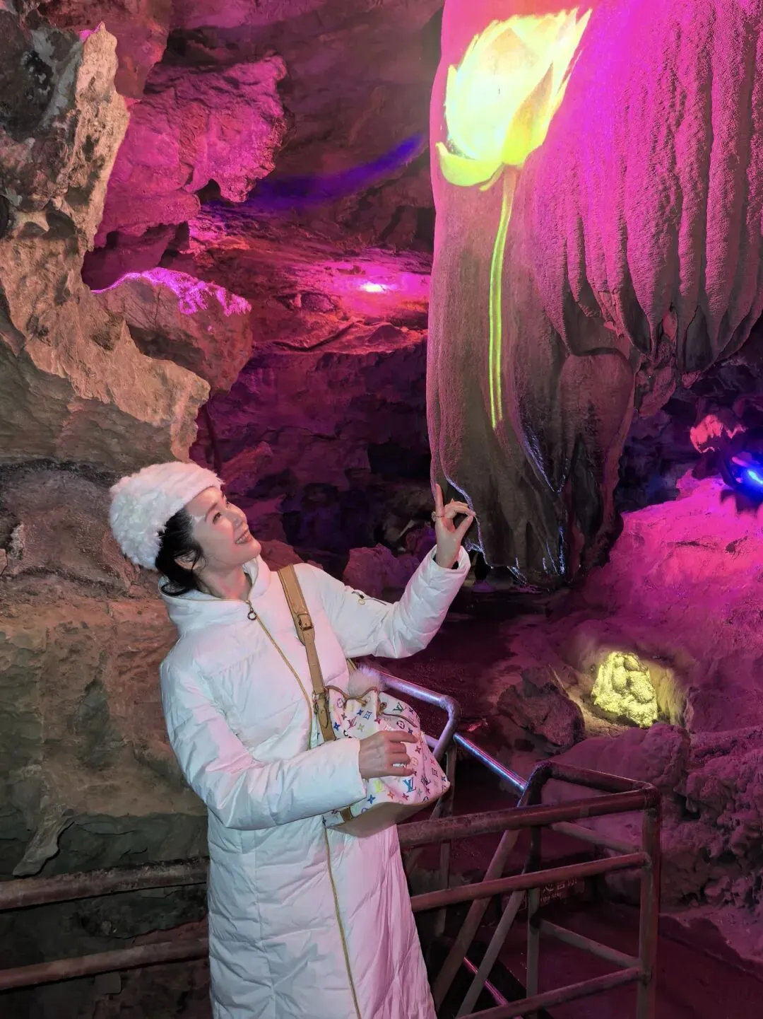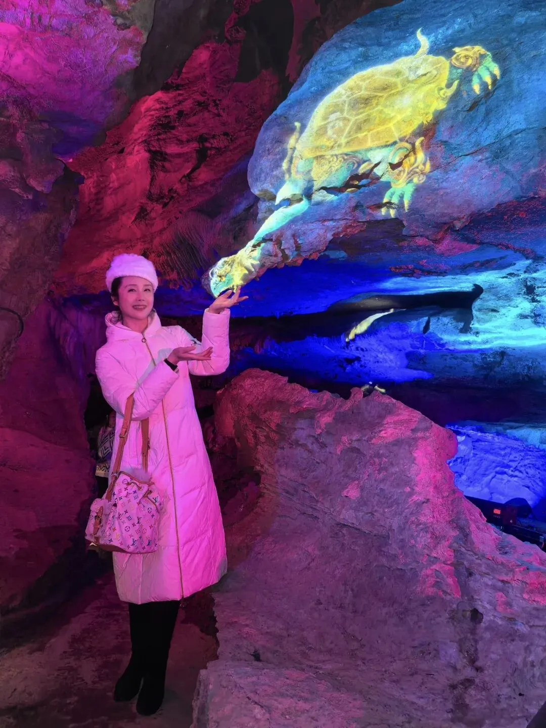 约行二三丈,豁然开朗,内洞到了。登陆的瞬间,回望来路,那逼仄的孔隙,竟有了一种神圣的仪式感。洞内又是另一番天地。蜿蜒的“双龙”依旧蟠于洞顶,一黄一青,在灯光的映照下,鳞爪毕现,栩栩如生。它们静默了千万年,守护着这地下的宫殿。钟乳与石笋,更是参差错落,仪态万方。有的如白鹤亮翅,有的如仙人悬佩,有的如琼林玉树,在方寸之地,营造出万千气象。同行的小童,指着那形似“仙桃”的巨石惊呼不已。而我,却偏爱那角落里一柱细小的石笋,顶端的水滴将落未落,晶莹剔透,仿佛凝固了时间。这亿万年的生长,竟浓缩于眼前这片刻的静止,怎不叫人感慨造物的神奇?