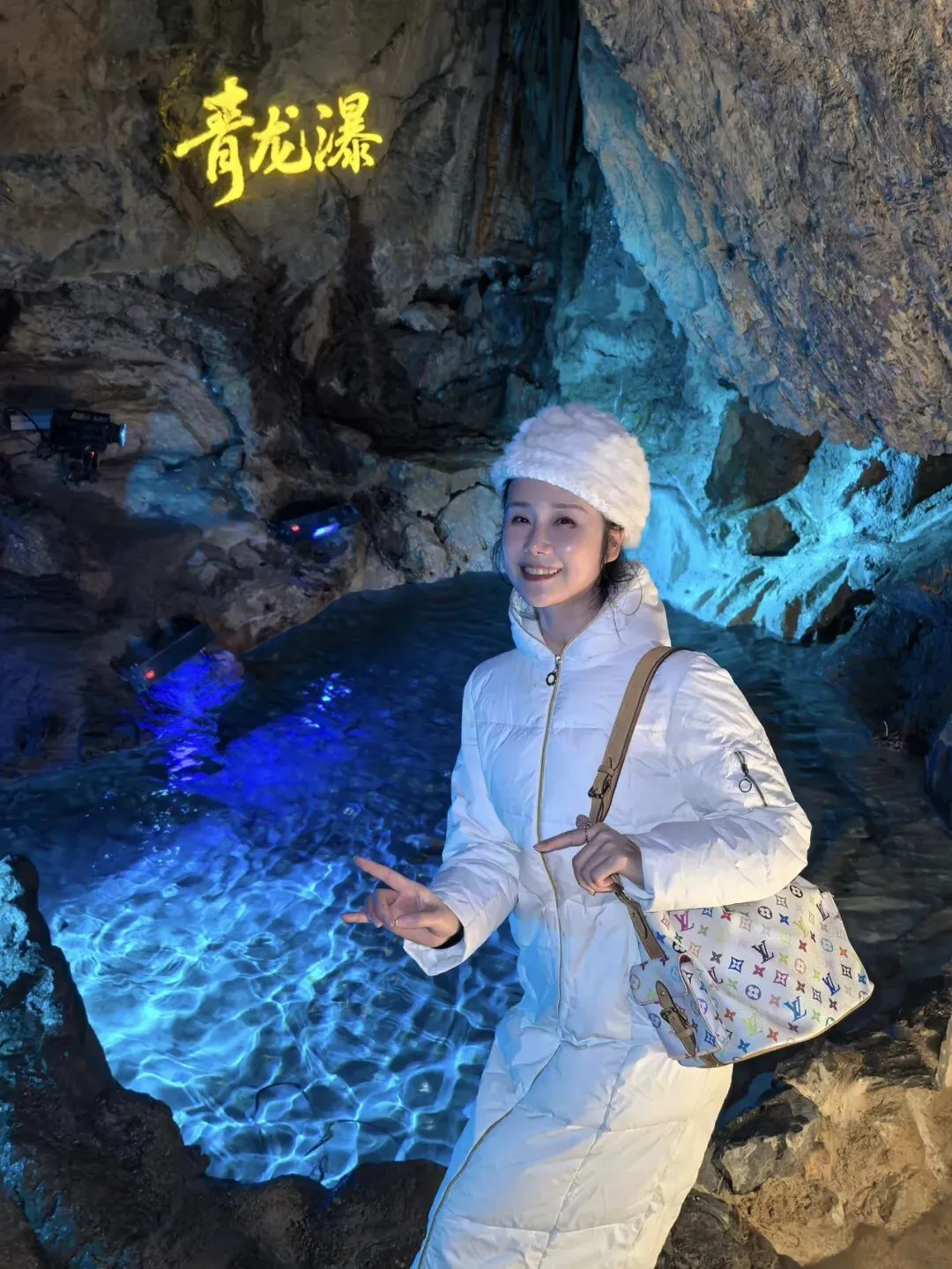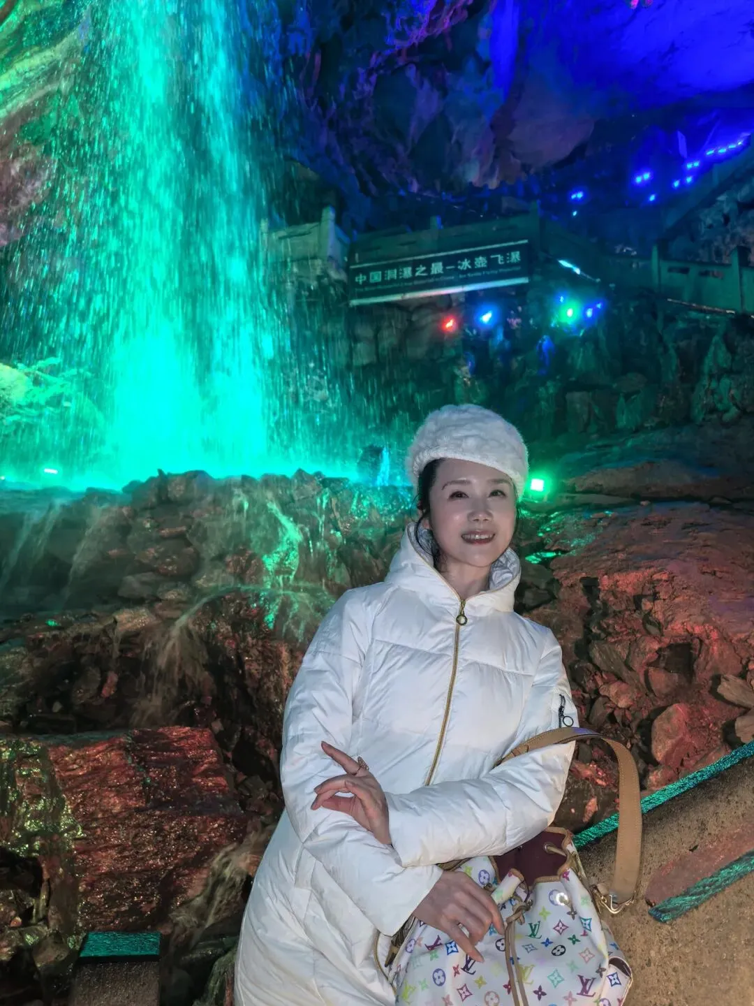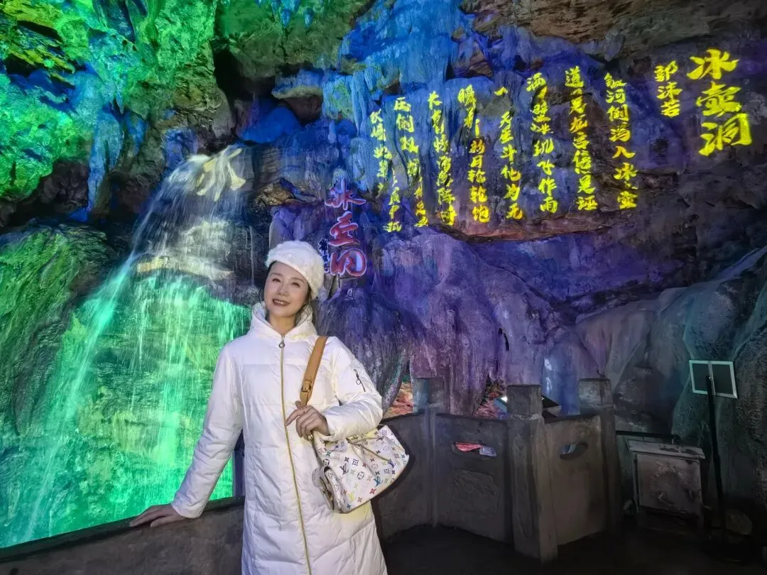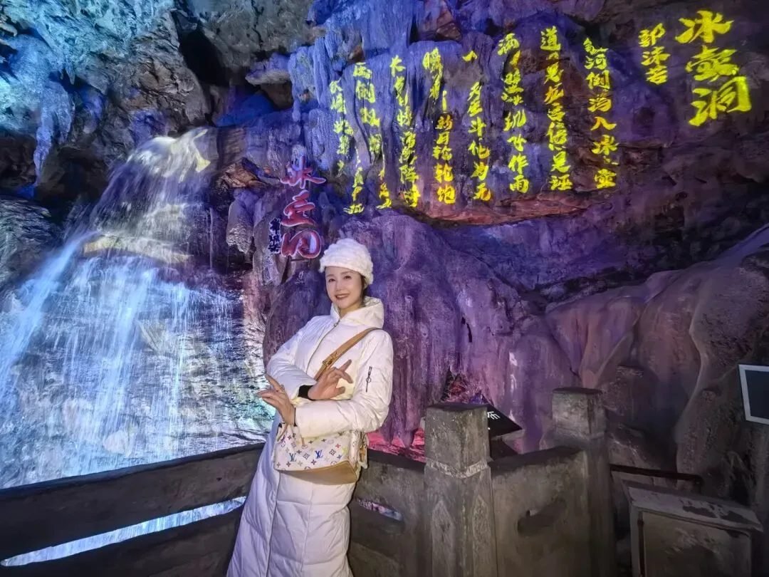 冰壶洞,这名字取得何其贴切!洞口朝天,肚大身长,寒气逼人,真如一只巨大的冰壶,盛满了天地的清泠。而那瀑布,便是从这壶口倾倒而下的银河了。一道白练,自二十余米高的洞顶飞泻而下,不作迟疑,不恋凡尘,直直地撞入洞底的深潭。水花迸溅,如碎玉,如飞珠,如漫天花雨,在灯光的照耀下,幻出七彩的光晕。轰鸣声回荡在空旷的洞厅里,震耳欲聋,却又让人觉得一种奇异的宁静。那是一种超越了声音的宁静,是天地间最原始的节奏,是水与石亿万年的对话。