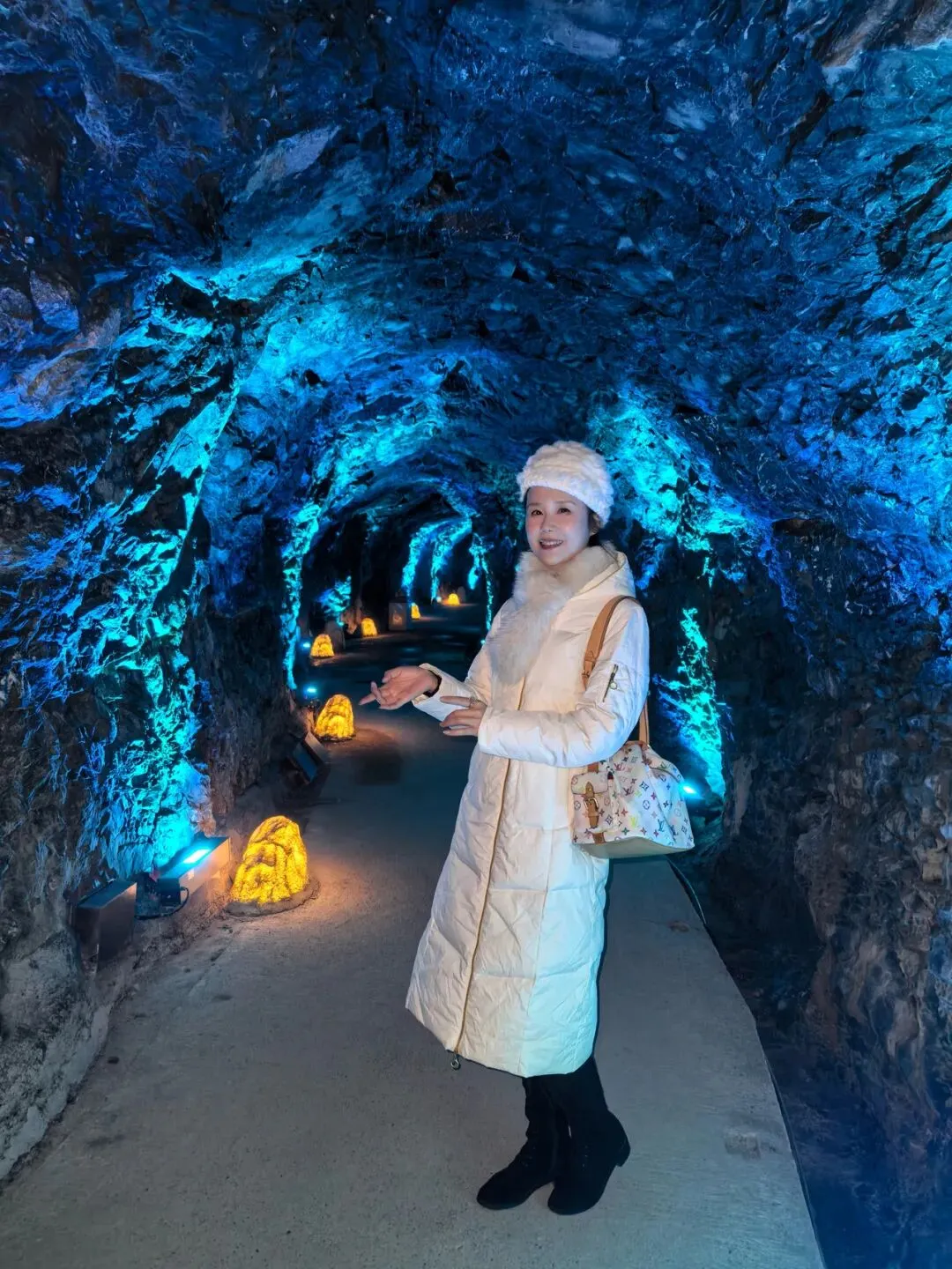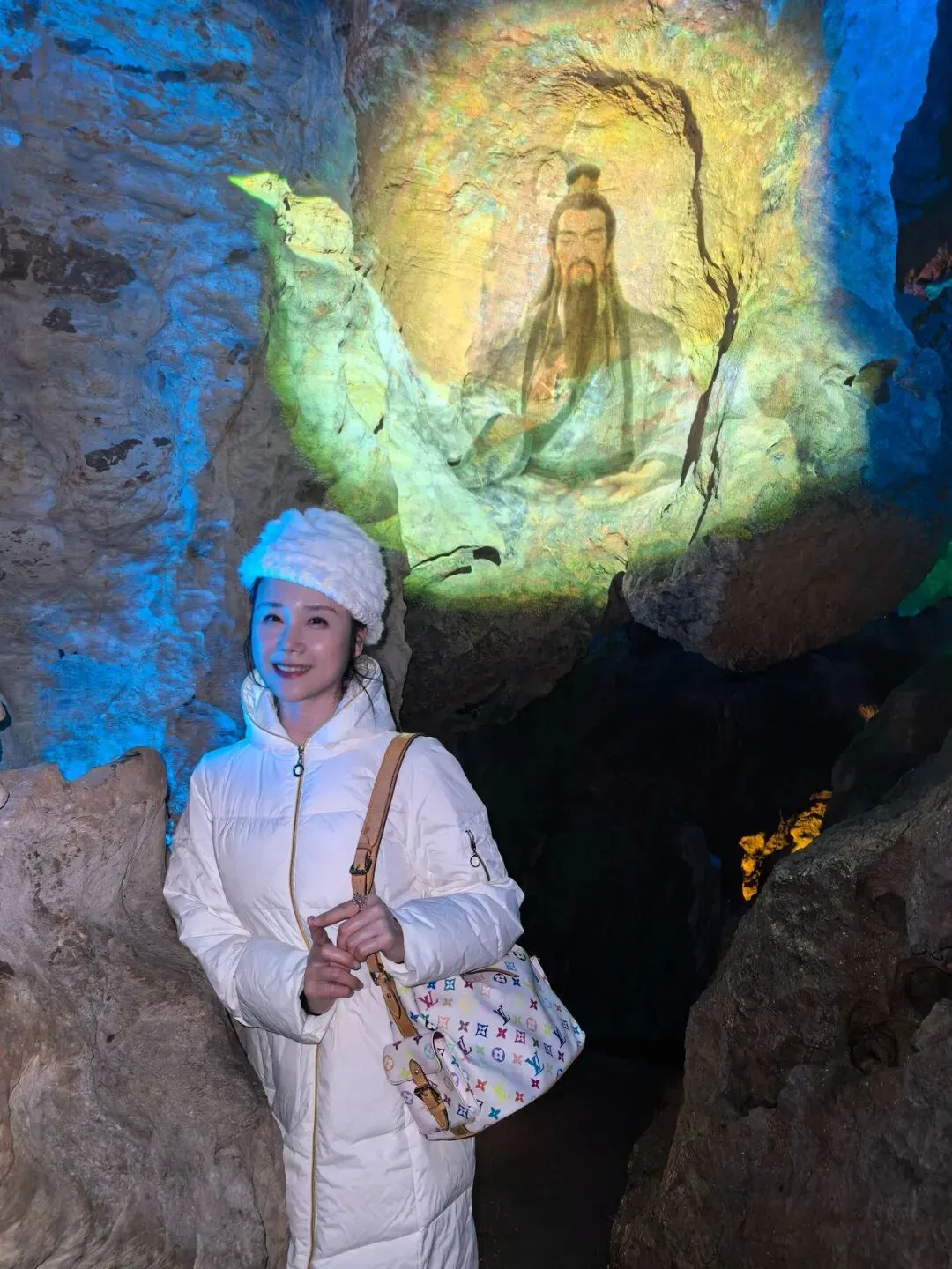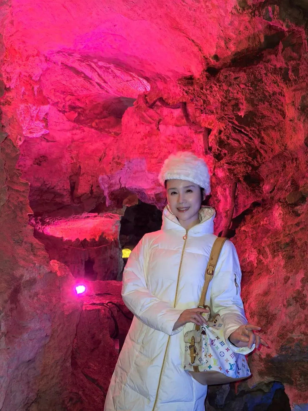 冰壶洞,这名字取得何其贴切!洞口朝天,肚大身长,寒气逼人,真如一只巨大的冰壶,盛满了天地的清泠。而那瀑布,便是从这壶口倾倒而下的银河了。一道白练,自二十余米高的洞顶飞泻而下,不作迟疑,不恋凡尘,直直地撞入洞底的深潭。水花迸溅,如碎玉,如飞珠,如漫天花雨,在灯光的照耀下,幻出七彩的光晕。轰鸣声回荡在空旷的洞厅里,震耳欲聋,却又让人觉得一种奇异的宁静。那是一种超越了声音的宁静,是天地间最原始的节奏,是水与石亿万年的对话。