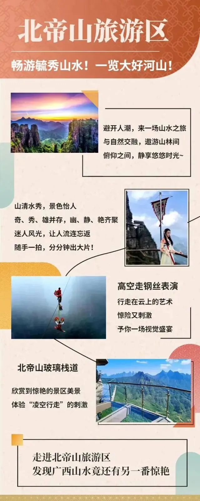 【平南北帝山旅游区】高空走钢丝杂技表演等,一览大好河山,来一场说走就走的山水之旅吧!点击下方名片,关注“小海豚 贵港说走就走” 收拾行囊,和世界的美好不期而遇 每一次出游都是生活的最佳注脚