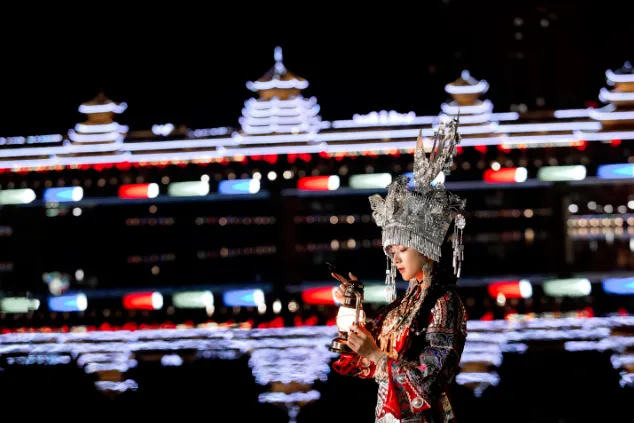 夜幕降临,巫水画廊华灯初上,一河两岸灯火绵延,民族风雨桥在光影勾勒下更显古朴灵动。河水泛着粼粼波光,与沿岸景观灯、文化长廊交相辉映,勾勒出独具苗侗特色的山水夜景。