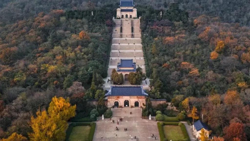 中山陵整个建筑群依山势而建,由南往北沿中轴线逐渐升高,主要建筑有牌坊、墓道、陵门、石阶、碑亭、祭堂和墓室等,排列在一条中轴线上,体现了中国传统建筑的风格。从空中往下看,像一座平卧在绿绒毯上的“自由钟”,寓含“唤起民众,以建民国”之意。
