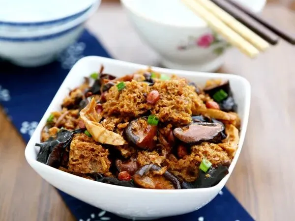 烤麸吸收香菇、木耳、花生等食材的鲜味