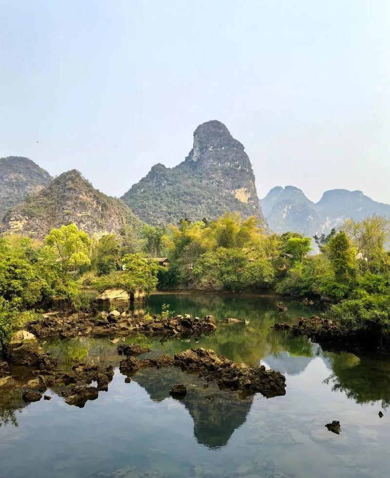 明仕田园经常被人说成"小桂林",但这个比喻其实不准确,明仕和桂林完全是两个东西,桂林的山水是那种"江作青罗带、山如碧玉簪"的精致,明仕的山水是那种"我就长在这、该什么样就什么样"的随意。你在明仕看到的不是被打磨过的景观,是真正还在运转的乡村,水田里有人插秧、竹筏上有人撑篙、村子里有人晒谷子,山就长在田边上,云就飘在山腰上,这种状态才是广西山水真正的底色,不是给你看的,是人家本来就这么活着。