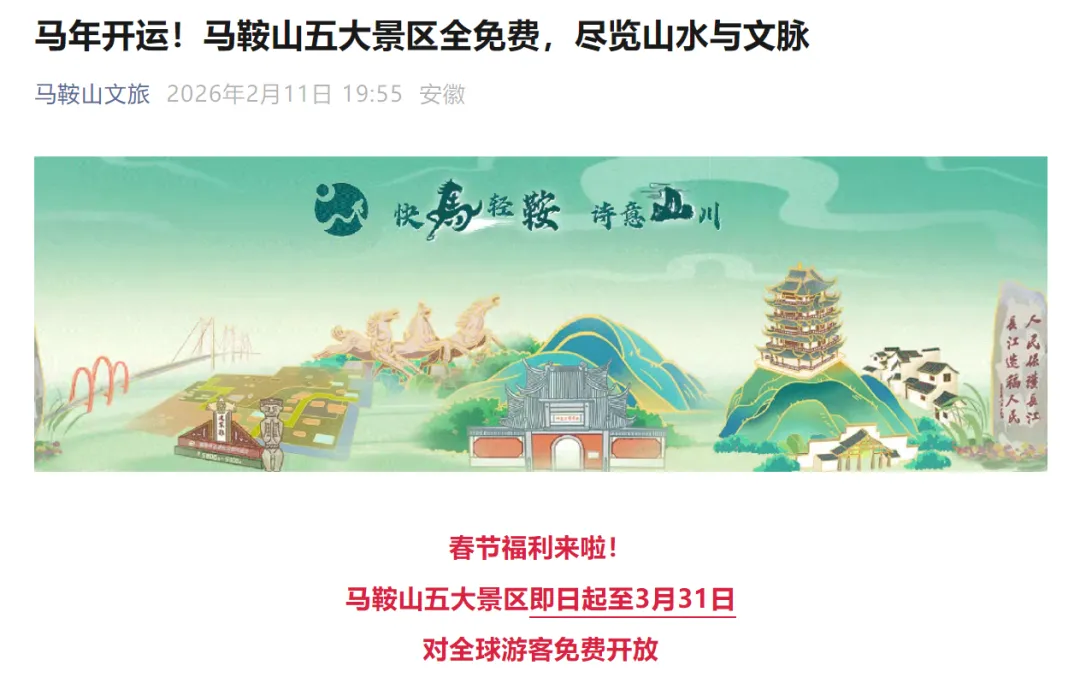 ✅马鞍山五大景区2月11日起至3月31日对全球游客免费开放!