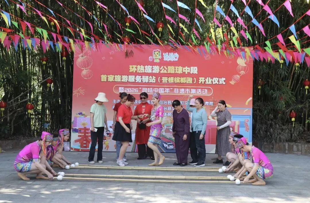 3月1日上午,环热带雨林国家公园旅游公路琼中段首家旅游服务驿站——营根槟榔园驿站正式开业,标志着琼中在完善“交通+旅游”融合服务体系上迈出重要一步。同日,2026年“寻味中国年”非遗市集活动在驿站内同步开启,吸引了众多市民游客前来打卡体验。