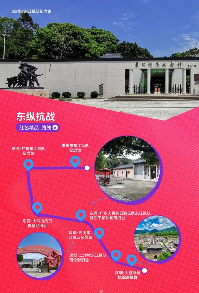 深圳(大鹏所城抗战遗址群、土洋村东江纵队司令部旧址、深圳坪山东江纵队纪念馆)—东莞(广东人民抗日游击队东江纵队路东干部训练班旧址、大岭山抗日根据地旧址、广东东江纵队纪念馆)—惠州(惠州市东江纵队纪念馆)