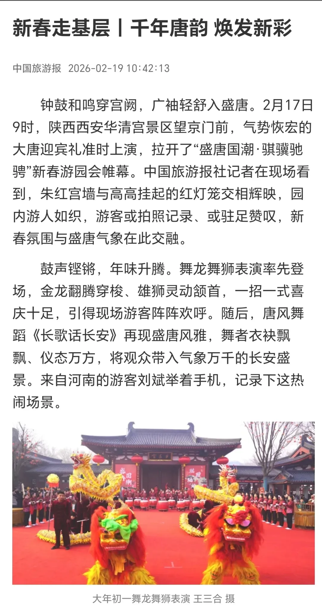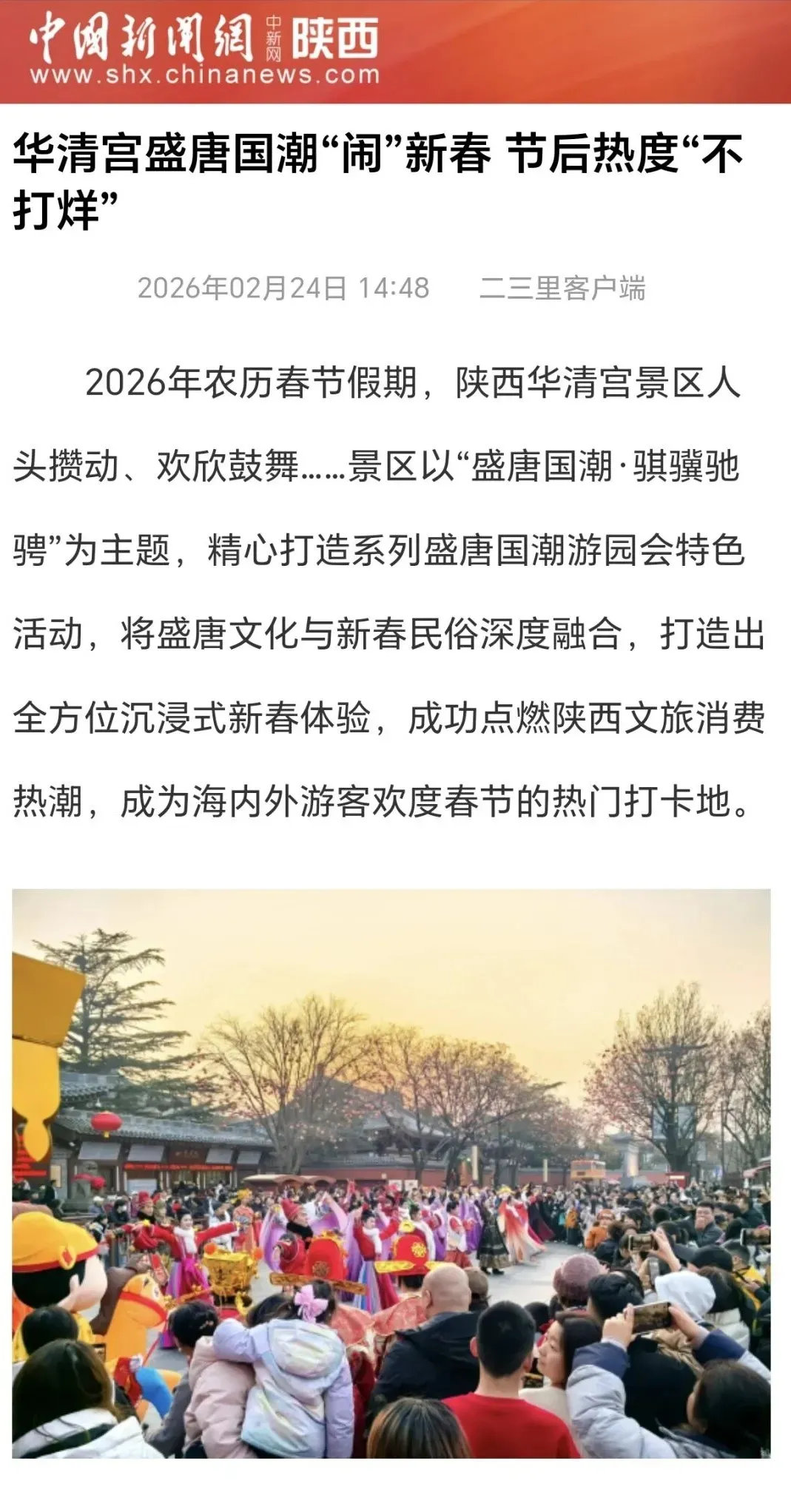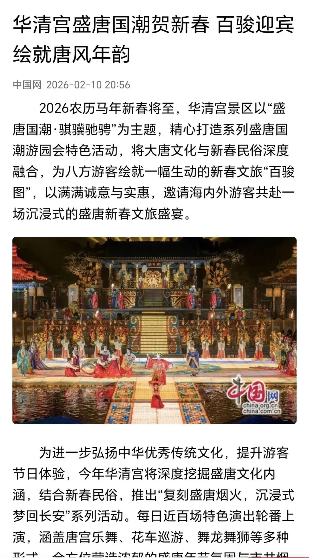 金蛇随冬去,骏马报春来。2026年2月16日20时,央视马年春晚准时开播,以“欢乐吉祥、喜气洋洋”的喜庆氛围及创新创意精品节目,为全球华人奉上一道“文化大餐”。陕旅华清宫艺术团再次亮相《2026年中央广播电视总台春节联欢晚会》舞台,以专业、精湛的艺术水平,深深打动亿万观众。这也是继多次亮相央视各大晚会之后,艺术团再登央视舞台,用实力书写了新的高光时刻。