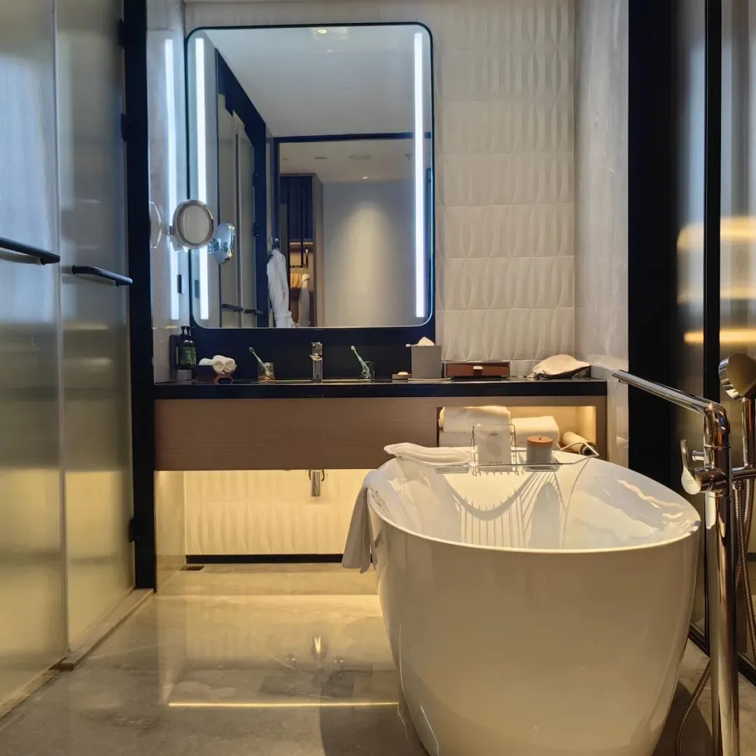 卫浴部分采用现在很多酒店都会采用的拉门隔断,入门的高级房型没有浴缸。