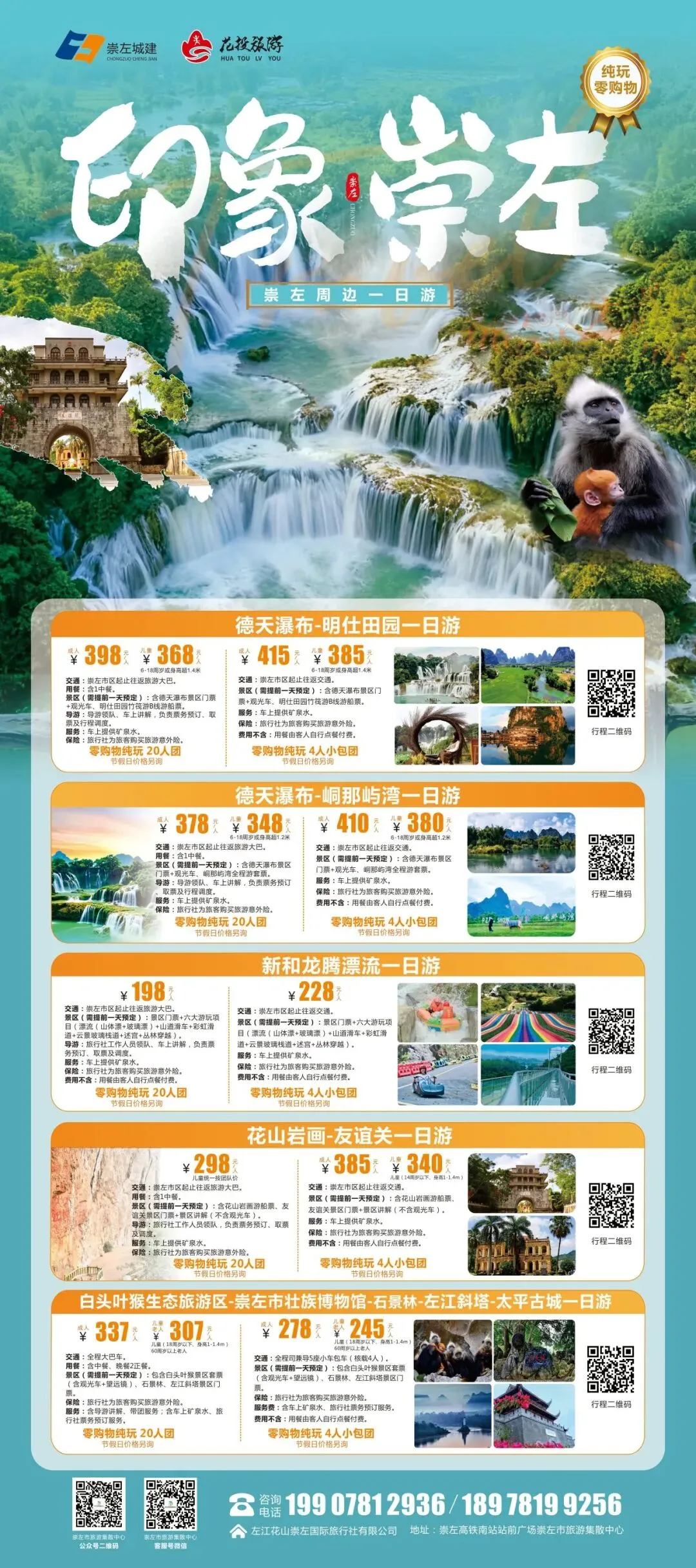 今年春节,家庭出游、朋友结伴的 “崇左纯玩私享团”及“包车游” 需求旺盛。针对游客追求“私密、省心、深度”的特点,我们推出了2-6人私享小包团,提供“专车+专属导游+灵活行程”服务,推出了六条精品线路“德天瀑布+明仕田园一日游”、“德天瀑布+峒那屿湾一日游”、“新和龙腾漂流一日游”、“花山岩画+友谊关一日游”、“白头叶猴生态旅游区+崇左市壮族博物馆+石景林+左江斜塔+太平古城一日游”沉浸式山水之旅。