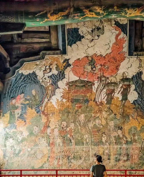 高都景德寺藏着一个很少有人注意到的细节:寺庙里的壁画全是元代原作,而且画的不是佛经故事,是当时的市井生活。你站在大殿里仔细看那些壁画,会发现里面有卖货的、看戏的、喝酒的、打架的,全是最普通的老百姓,这在佛教寺庙里非常罕见,因为按规矩,寺庙壁画应该画佛祖、菩萨、护法,怎么可能画这些世俗场景。