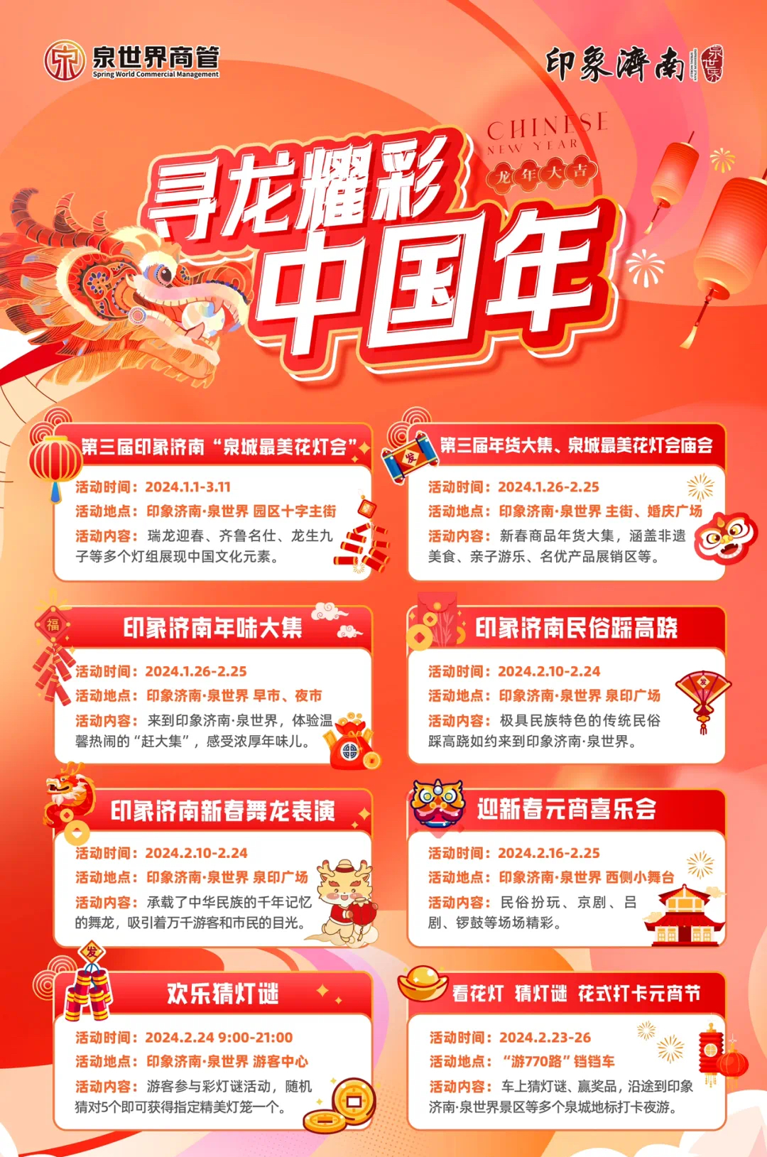 本届花灯会以“龙腾盛世泉甲天下”为主题,分为三大版块,在园区布置大型灯组40多个,再加上2.5万余米LED灯带的辉映,将让游客徜徉于五彩缤纷的梦幻世界,感受新年欢乐祥和的节日气氛。