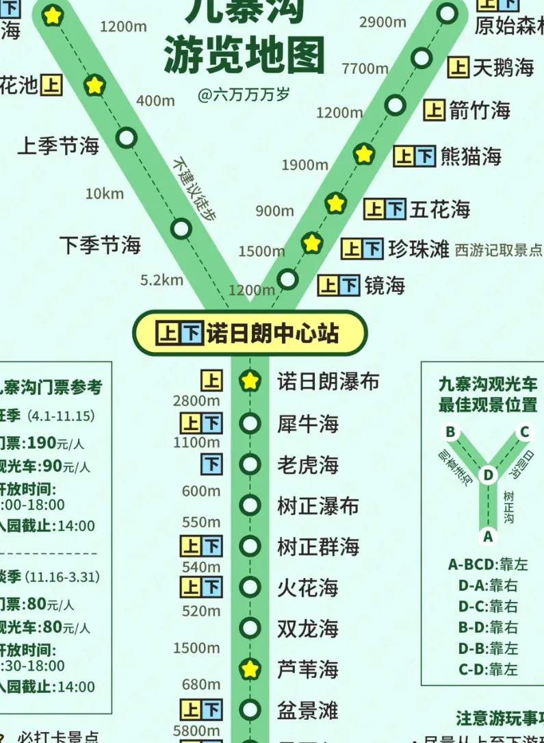 一天玩转九寨精华景点!不费腿不走回头路不踩坑!姐妹们快来抄作业!一天玩转九寨精华景点!不费腿不走回头路不踩坑!姐妹们快来抄作业! 🚗交通安排: 1️⃣ 05:30:成都市区出发,打车至成都东站 2️⃣ 06:45:乘坐第一班高铁,成都东站→黄龙九寨站(票价约128r,车程1h45min) 3️⃣ 08:30:抵达黄龙九寨站,出站后直奔黄色景区大巴(现场购票,车程2.5h,票价约51r) 4️⃣ 11:10:到达景区入口(拼车至景区门口约15r/人) 5️⃣ 11:30 - 17:30:景区内游玩6h 🎫门票预约:提前1天在“阿坝旅游网”购票(旺季套票280r,淡季套票160r,刷身份证入园) 🚌游玩路线: 路线:建议左沟➡️右沟➡️下沟,游览时间含步行与拍照,灵活调整观光车路线。 📍左沟精华(1.5h) 1️⃣ 长海🌟(海拔3100m):九寨沟最大海子,雪山倒映很美(约30min) 2️⃣ 五彩池🌟:枯水期水量少但颜色绚丽。扶梯上俯拍更出片(浏览约30min,乘车到诺日朗约25min) 📍右沟精华(3h) 1️⃣ 熊猫海:可以偶遇水獭~(约30min) 2️⃣ 五花海🌟:色彩最丰富的海子,蓝绿渐变如打翻调色盘(约30min)