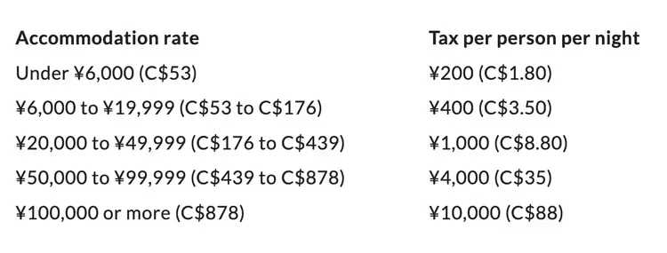 根据京都市观光协会公告,新税制下每人每晚最高可征收10,000 日元(约合 87.82 加元),具体金额依住宿价格而定。