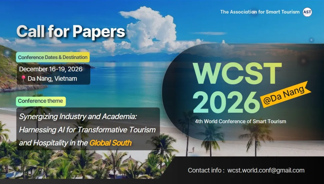 第四届世界智慧旅游大会(4th World Conference on Smart Tourism, WCST 2026) 以 “产业与学术协同:以人工智能推动全球南方旅游与酒店业转型发展” 为主题,聚焦在人工智能技术迅速重塑旅游与酒店产业生态背景下,协同创新的重要性与紧迫性。 在全球南方诸多国家与地区,人工智能技术的发展、数据驱动的服务模式以及数字基础设施的持续完善,正为提升产业竞争力、促进包容性增长及推动可持续旅游发展带来前所未有的机遇。然而,这些技术的有效应用离不开高校、产业主体与公共机构之间的紧密合作,以共同应对能力差距、技术获取公平性、伦理治理以及以社区为中心的发展等关键挑战。 WCST 2026 致力于打造一个充满活力的国际交流平台,汇聚学者、业界实践者与政策制定者,共同探讨发展路径、分享前沿洞见,并协同构建创新解决方案,推动全球南方在人工智能驱动的旅游时代实现转型与赋能。 会议欢迎但不限于以下研究方向: ✅ Short Paper(短论文) ✅ Undergraduate Pitching Competition(本科生创新展示) 即日起至2026年9月30日(12:00 PM,KST/GMT+9) 2026年10月1日–10月31日 2026年11月1日–11月30日 2026年12月16日–19日(会议期间) 2️⃣ 注册费用