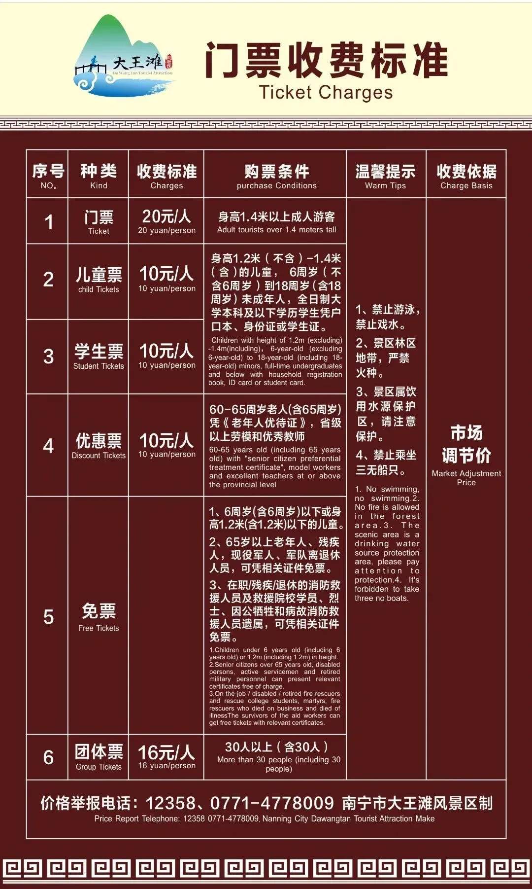2026年3月1日—4月30日,可享半价游景区——标准门票:10元/人,儿童/学生/优惠票:5元/人,团体票:8元/人。(来源:大王滩风景区)