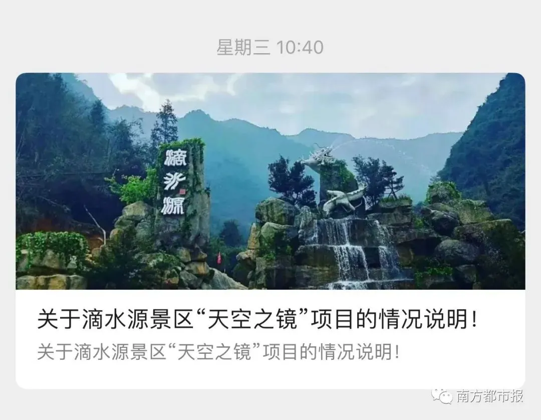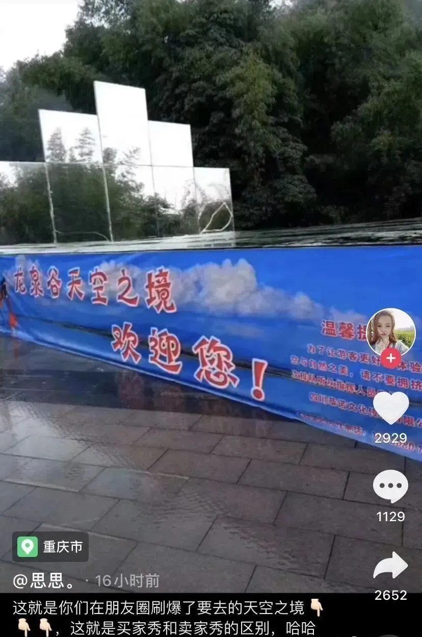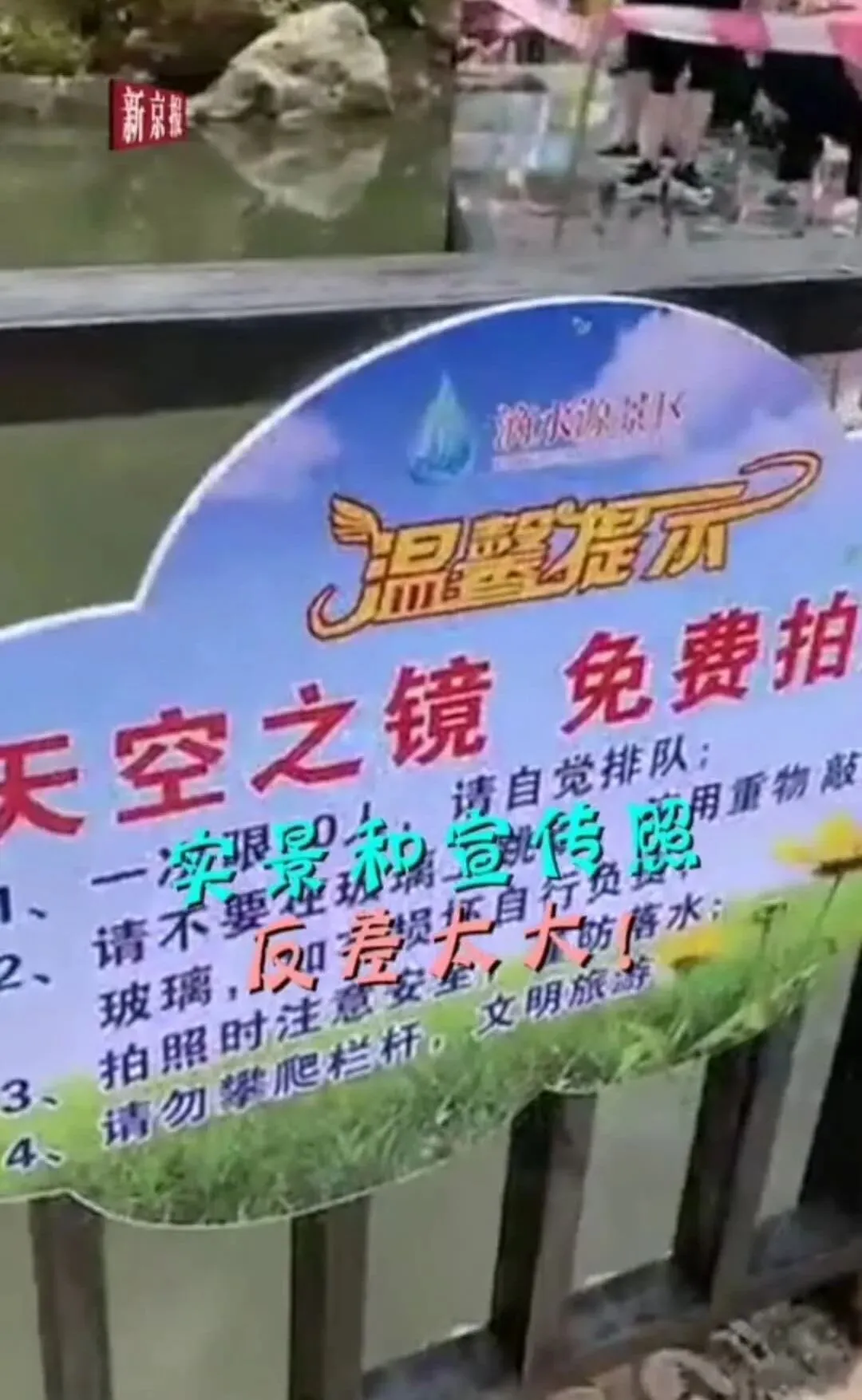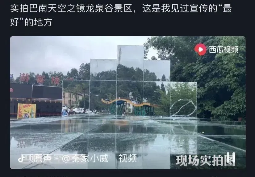 通报全文↓↓ 关于滴水源景区 “天空之镜”项目的情况说明 近日,有网友拍摄短视频,反映滴水源景区“天空之镜”项目存在“买家秀”和“卖家秀”的区别,引发各地网友广泛关注。对此,景区高度重视,现就有关情况说明如下: 近期,景区开展了转发微信朋友圈赠送景区门票的活动,同时免费对游客开放最新打造的“天空之镜”项目。 但是在前期预热过程中,我们的宣传团队把关不严,使用的宣传照片过度渲染,导致与游客实拍反差很大。后期的管理组织也未能跟上,造成现场凌乱的感觉,给广大游客带来了极为不好的体验感。对此,滴水源景区诚恳地接受广大游客和网友的批评和建议,并表示最诚挚的歉意!我们立即全面整改,并撤除活动广告,整改期间暂不对外开放。 滴水源景区真诚地欢迎广大网友和游客的监督。 临武县滴水源景区 2020年5月26日 这种所谓“天空之镜”全国各地都有 很多网友打卡后直呼“踩雷啦” 甚至有网友发现 这些景点的宣传图片和文案 都长一个样