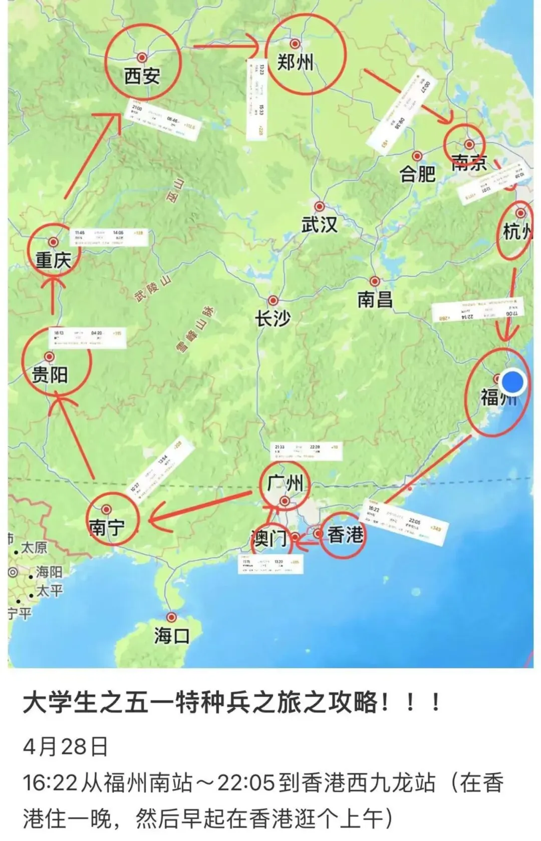 这份计划名为“大学生之五一特种兵之旅之攻略”,由小红书网友@懒发布。楼主计划4月28日从福州出发,5天内坐高铁打卡10个省份。如果能成行,他的旅行轨迹将在中国版图上画出一个大大的圈。