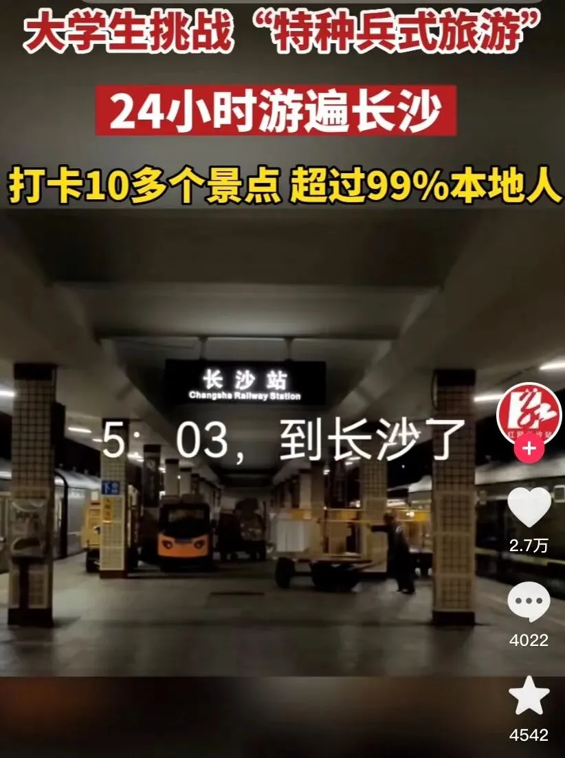 短视频平台上,有大学生从广东出发,挑战24小时游遍长沙,打卡10多个景点。流水账式的旅程,时间单位可以精确到分钟,当日步数超过4万步。看似在旅游,实则是对严密规划能力和超强执行力的炫耀。