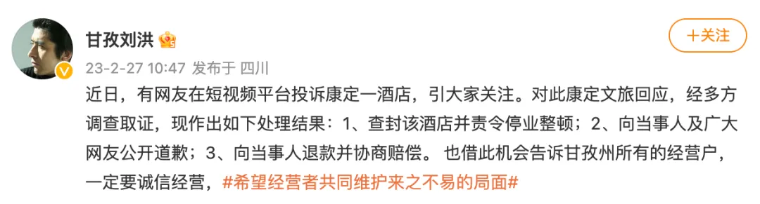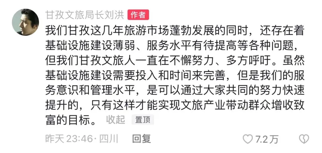 网友的好评不仅仅来自于当地的处理速度和执行能力,更是来自于刘洪局长直面回应问题的态度。从春节期间各地频频爆出宰客新闻就可以看出,游客们苦商家“套路"久矣。刘洪局长放下一句“谁砸了我们甘孜旅游的锅,我一定砸了你的饭碗。”的“狠话”,体现的是当地对于诚信经营的重视和真切维护游客权益的态度,用最直接的方式建立起游客对当地旅游的信任。