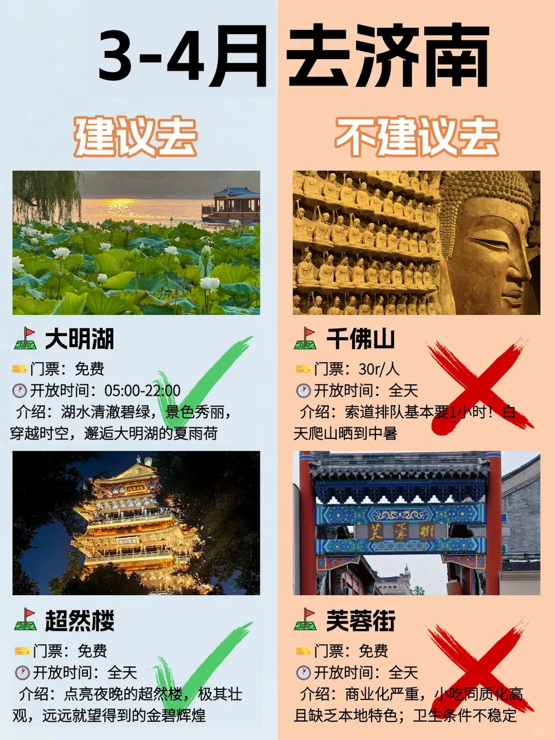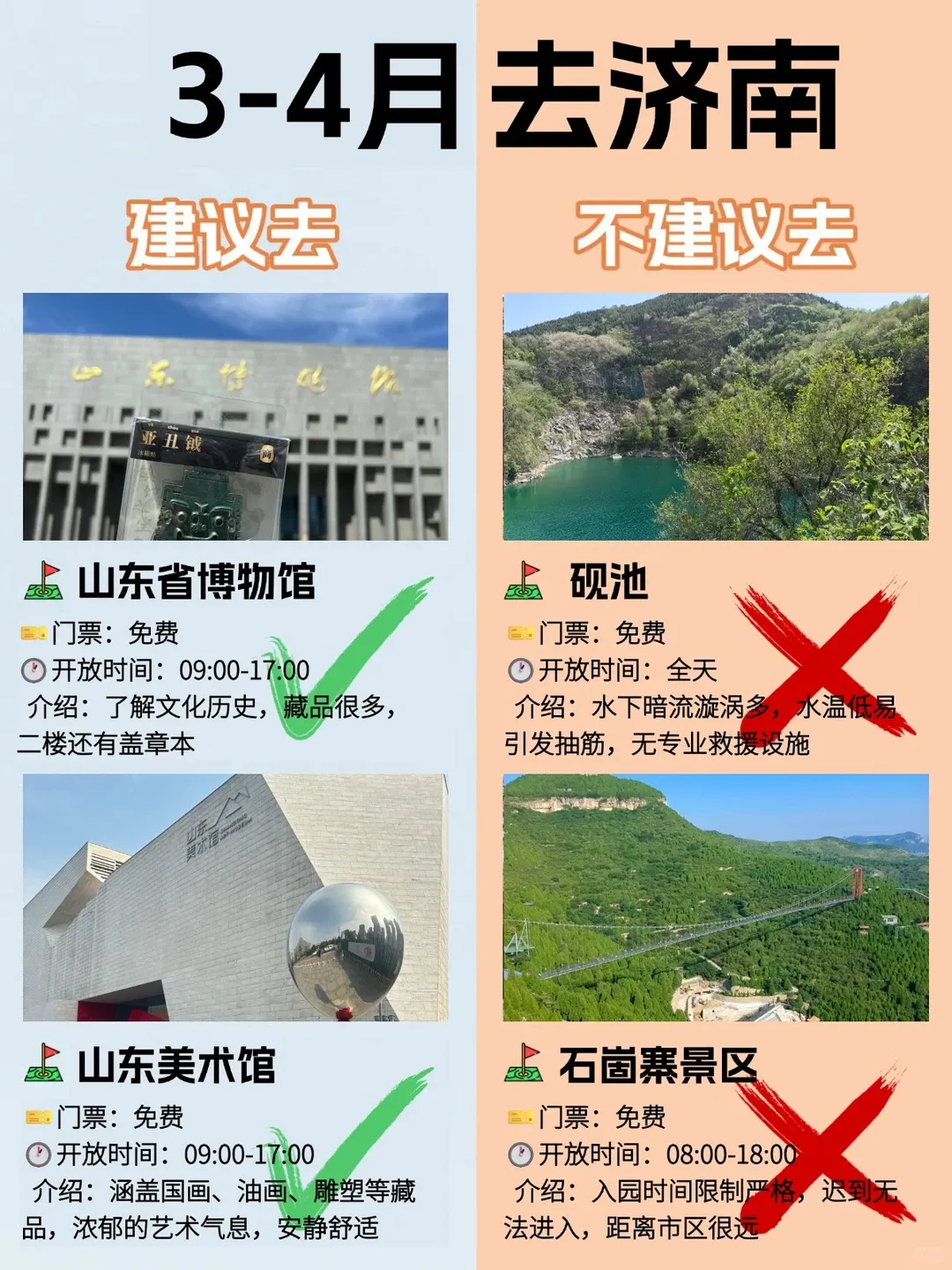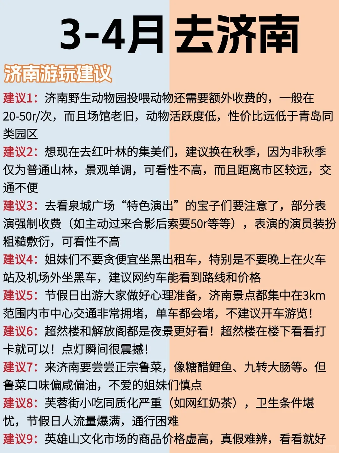 想来济南玩的宝子别盲目冲,临时起意真的容易踩坑 😭3-4 月是济南赏花好时节,春暖花盛、人少舒适,做好攻略才能玩得爽,这份血泪总结的避坑指南收好~ - 🌤️ 济南的天气 3-4 月:平均气温8℃-22℃,早晚偏凉,中午温暖,温差很大! 穿搭:白天穿长袖、薄卫衣、休闲裤,薄外套、帽子、墨镜必备,春季风大紫外线也强!