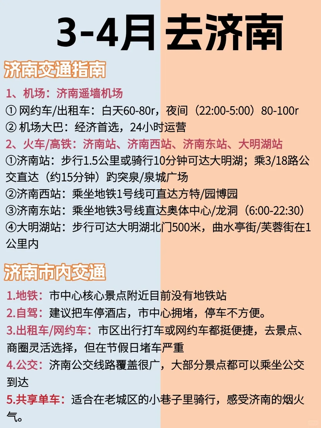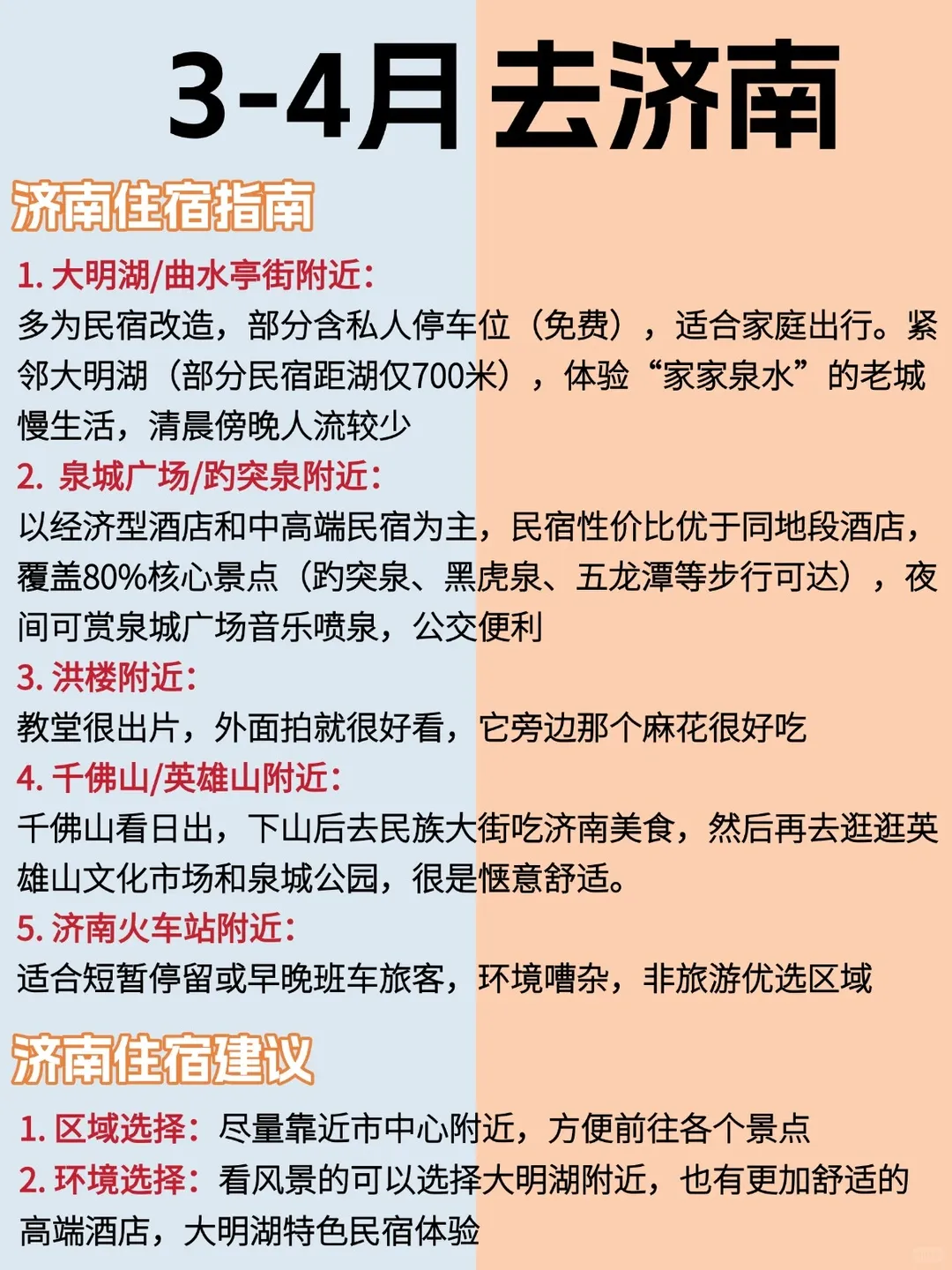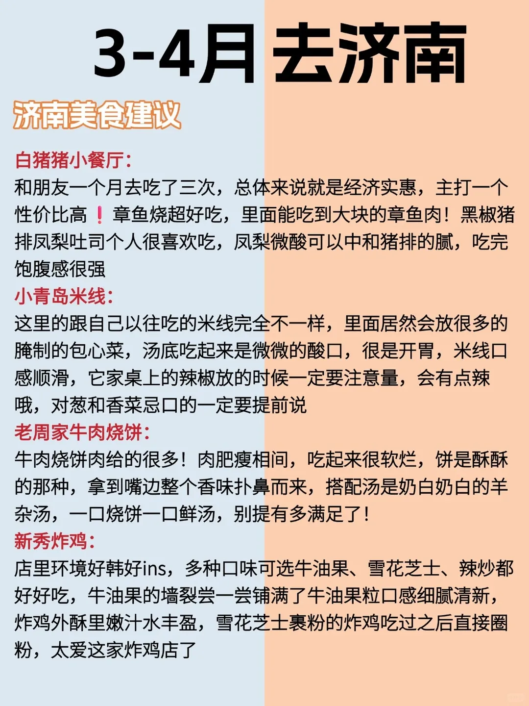 3-4 月的济南,是泉水叮咚 + 繁花满城的黄金季,气温舒适、花事密集,既能逛老城泉韵,也能去南部山区踏青,非常适合 2-3 日深度游。 以上内容来自小红书@途家民宿上岸版🙏