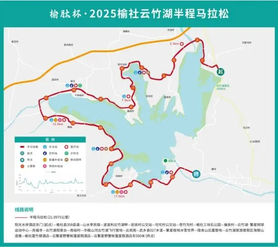 阳光水岸酒店东门(起点)→榆社县359县道→山水李民宿→波波利云竹湖畔→岩良村公交站→圪坨村公交站→苍竹沟村→榆社三块石公园→偏良村→云竹湖·繁星网球运动中心→资福寺→云竹湖观景台→南峪村→华舰山河云竹湖飞行营地→云岚阁→武乡县027乡道→繁星极地冰雪世界→隐舍山庄露营地→云竹湖旅游度假区海银山造像→榆社雲竹驿酒店→云繁星野奢帐篷度假酒店→云繁星野奢帐篷度假酒店东500米(终点)
