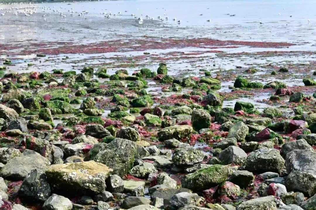 我这次来到黑石礁正巧赶上退潮,平时淹没在海水下的黑色礁石群大片露出真容,很多市民和游客走进这片“海上石林”,亲身感受大自然的鬼斧神工。 在礁石缝和水洼里寻找小螃蟹、寄居蟹、海螺,或者在滩涂上捡拾被海浪冲上来的海带和紫菜。这对小朋友和童心未泯的大人来说,都是充满乐趣的体验。