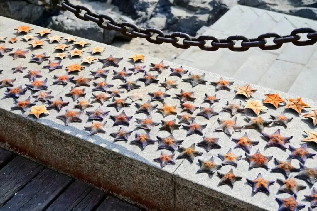 在岸边,我看到一些商贩在售卖赶海收获的海货,其中一排排海星整齐地摆放在石阶上,格外引人注目,看起来颇为壮观。 黑石礁东侧的木栈道已经与星海公园相连,看完礁石后可以沿着木栈道前往星海公园游玩。而西侧的木栈道目前只通到永达驾校南侧附近,不过我看到在退潮后,有人前往大连海洋大学校内的那片海域赶海。