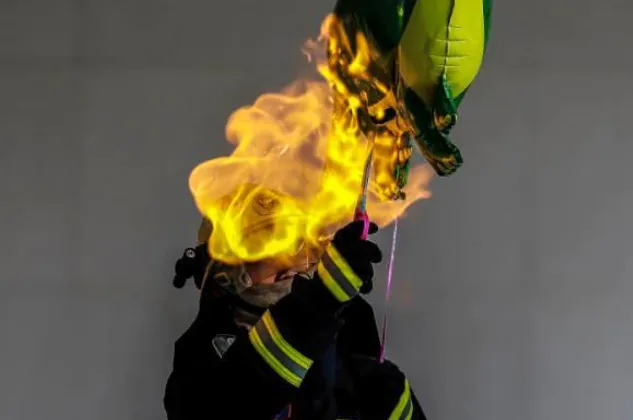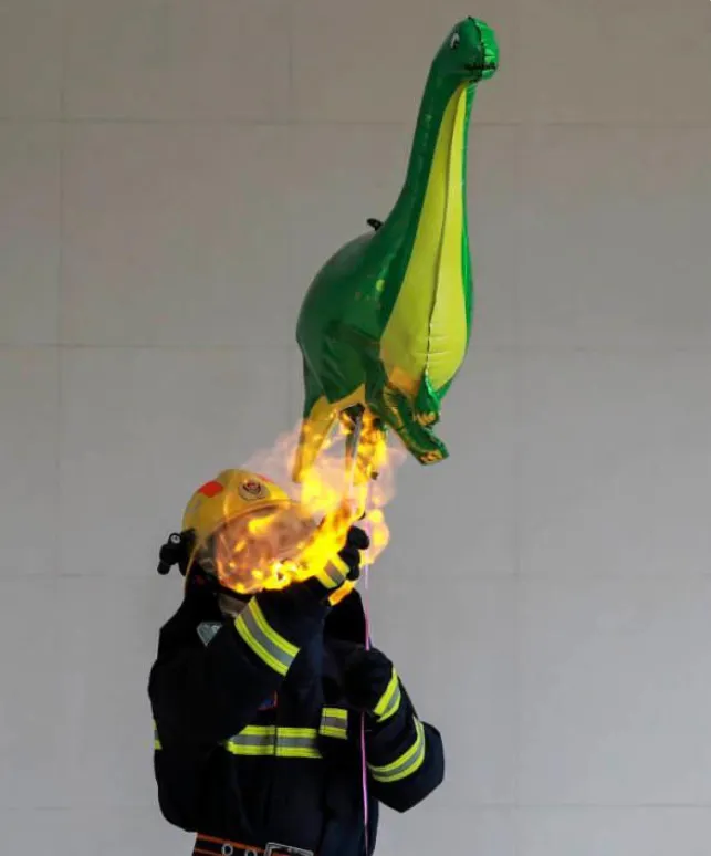 实验中消防员穿戴好防护服 在室外空旷的位置 用打火机靠近氢气球 氢气球瞬间被烧破 内部气体快速燃烧起来 消防提醒: