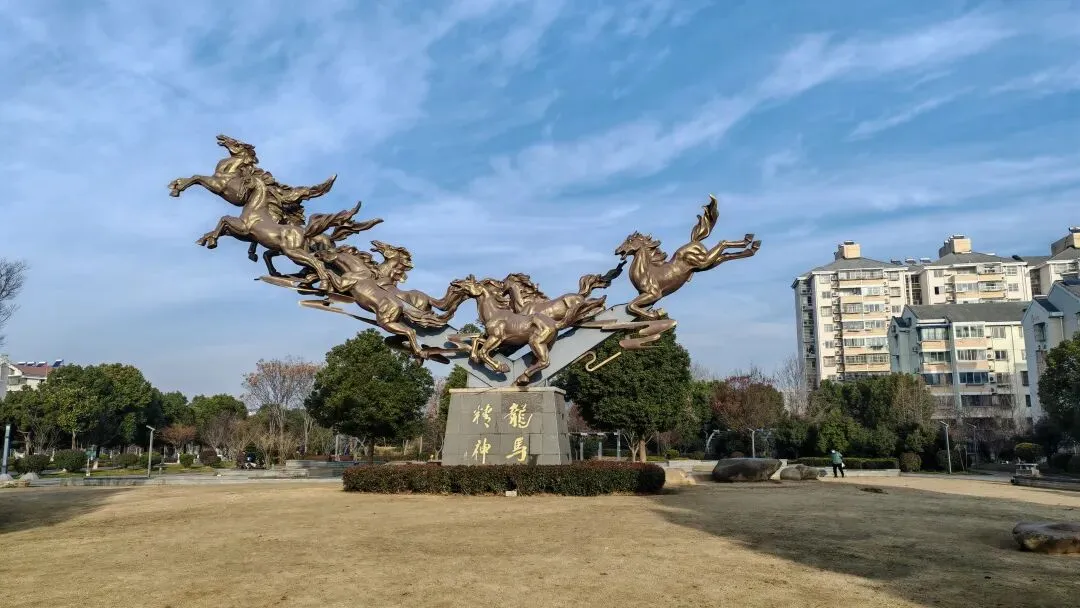 第三日背朝夕阳向西而行,过桥转弯间,方向似有变换,查看地图才知只是道路微斜。桥上一块界牌赫然在目——栖霞区界,原来跨过门前大桥,便已踏入栖霞地界。一路西行至花港路口,穿过立交桥下行,一座广场豁然眼前,便是马群市民广场。广场中央矗立着气势恢宏的雕塑,八匹骏马昂首腾飞,底座“龙马精神”四个大字格外醒目。查阅方知,马群一地,因明代朱元璋在此养马而得名,历史悠远。返程途中路过蛇盘小区,几匹白马雕塑旁的碑文记载,此地原名佘婆村,为古金陵驿所在,北宋王安石、抗金名臣李纲皆在此留有诗篇,文天祥被俘囚禁于此,更是写下千古名篇《金陵驿》,令人顿生怀古之情。