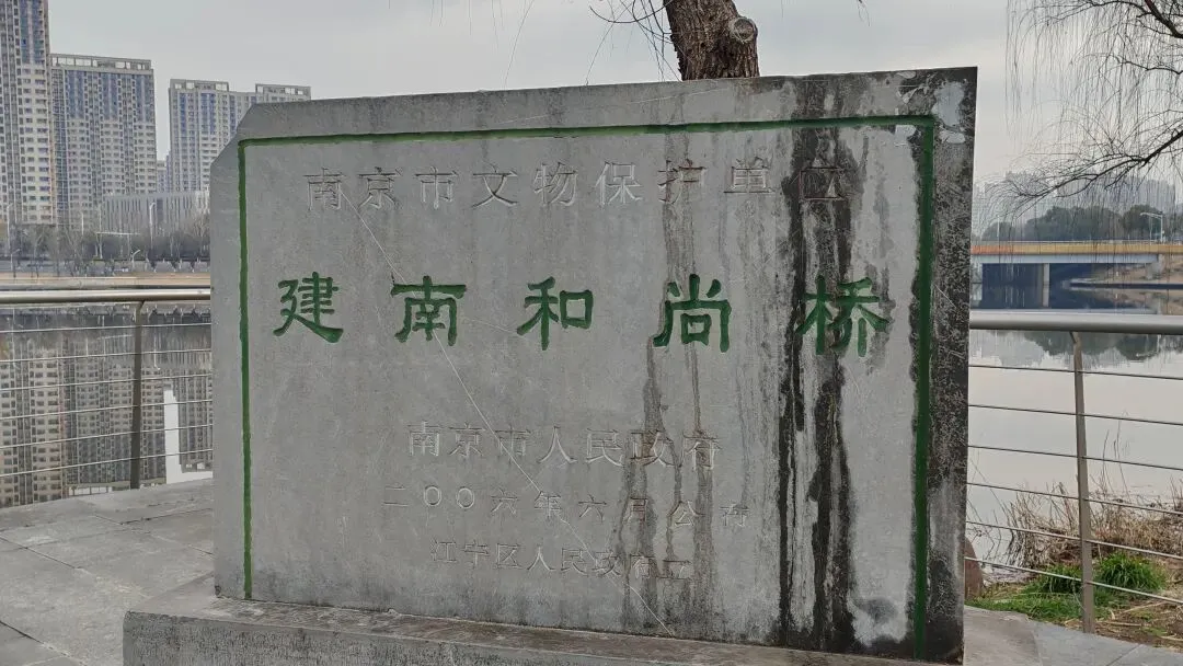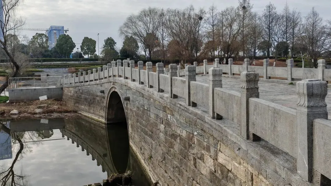 第四日择路南下,沿着运粮河畔慢行。河道时而临水,时而傍岸,随弯转向。这条河已静静流淌六百余年,始于明洪武年间,由朱元璋下令开凿,用以运送东郊粮草,河水源自青龙山、紫金山东南麓,最终汇入秦淮河。如今河道经过整治,已成市民休闲健身之地。河畔的博颂学校绵延数里,一路相伴,直至三河公园。公园因运粮河、上坝河、百水河三水交汇而得名,园内有开阔湖面、悬空步道与亲水栈道,可散步、可垂钓、可赏景。园中一座明代单孔石拱桥——建南和尚桥,被列为江宁区不可移动文物,青石板桥面、莲花纹栏板与岸边老柳相映成趣,古桥静立,与远处现代化的科技楼宇遥遥相对,一古一今,见证岁月变迁与时代发展。