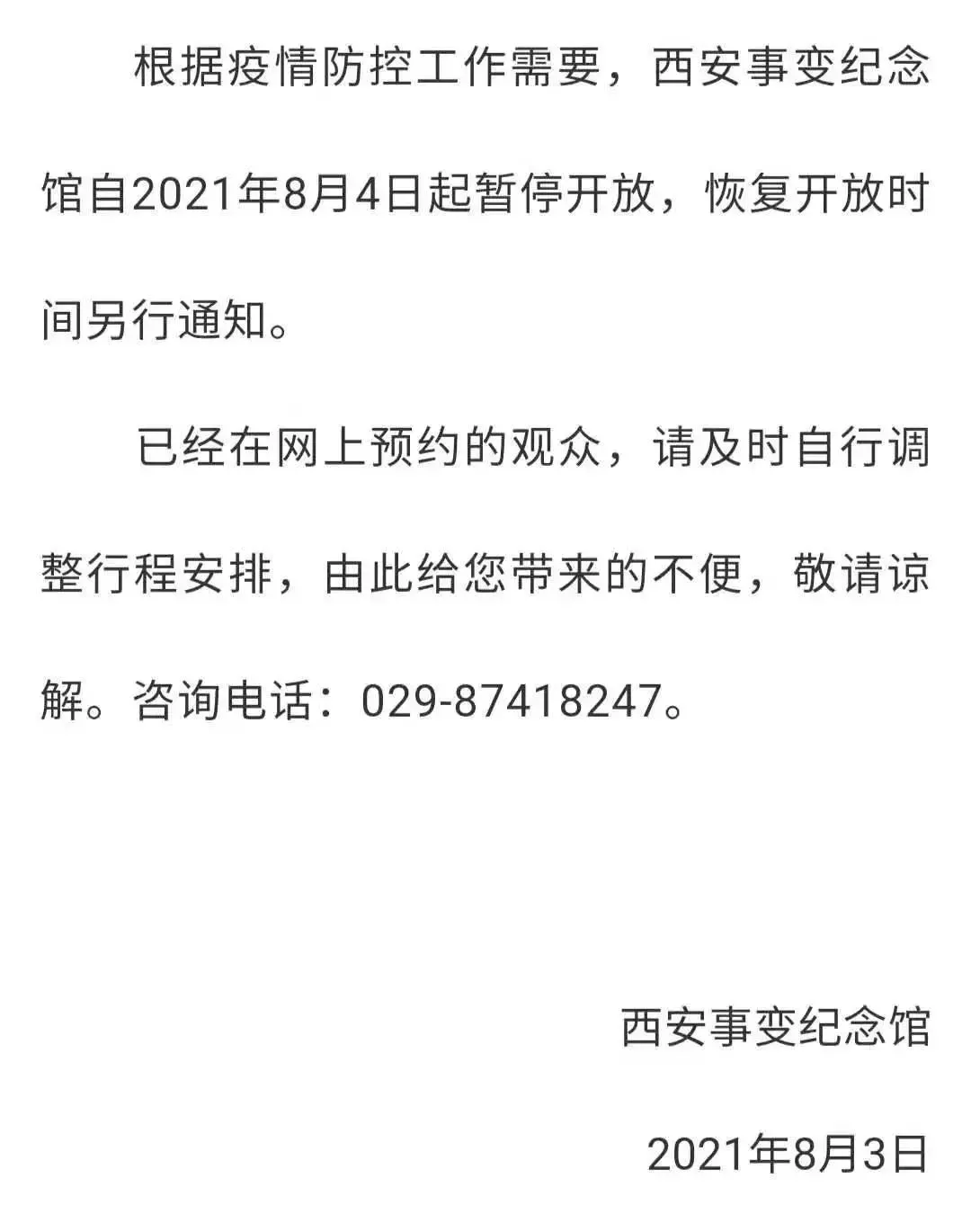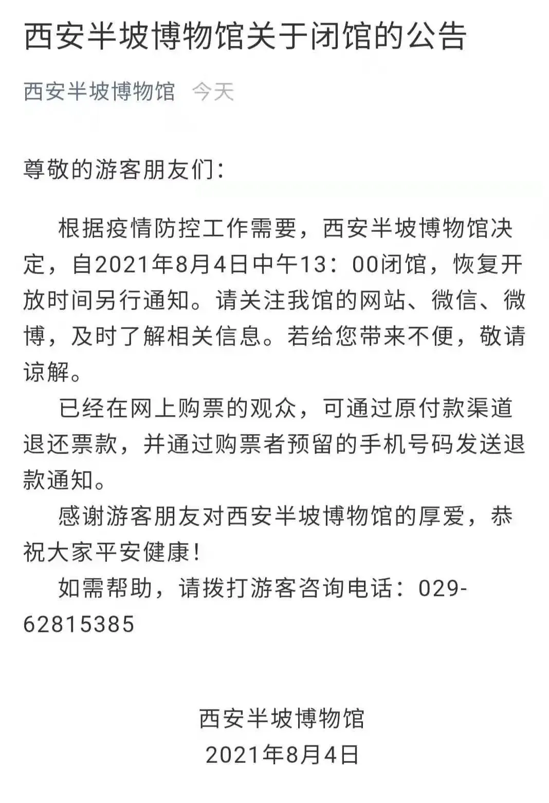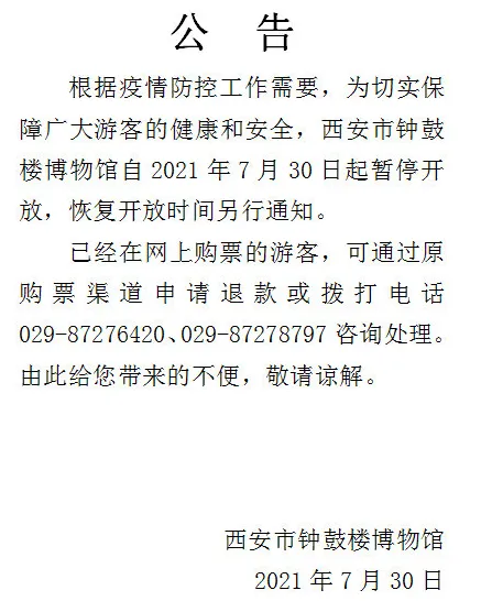 西安博物院自2021年8月4日(星期三)14:00暂停对外开放(闭馆、闭园),恢复开放时间另行通知。已经在网上购票的观众,可通过原预约渠道退还票款。