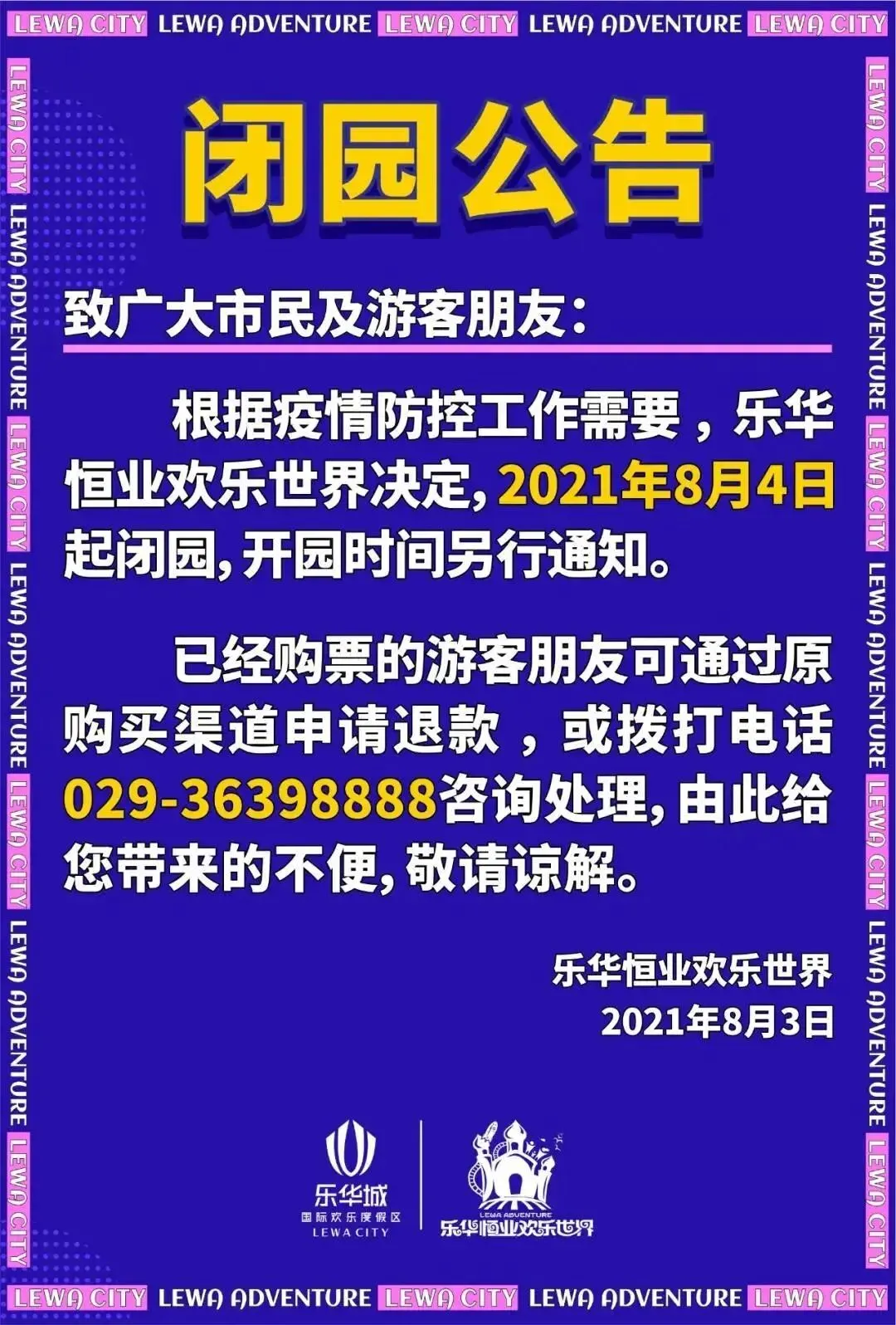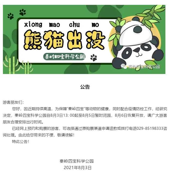 自8月3日13:00起至8月5日暂时闭园,8月6日恢复开放。