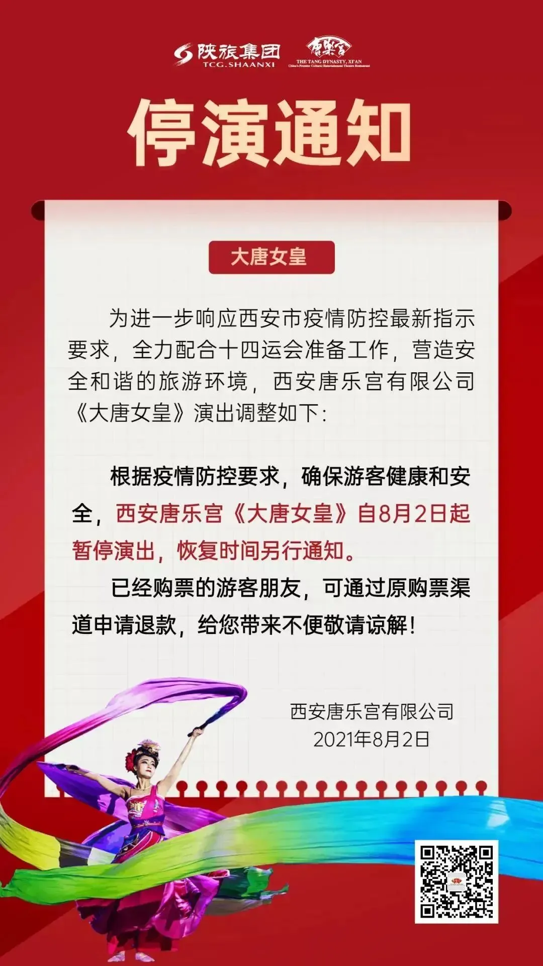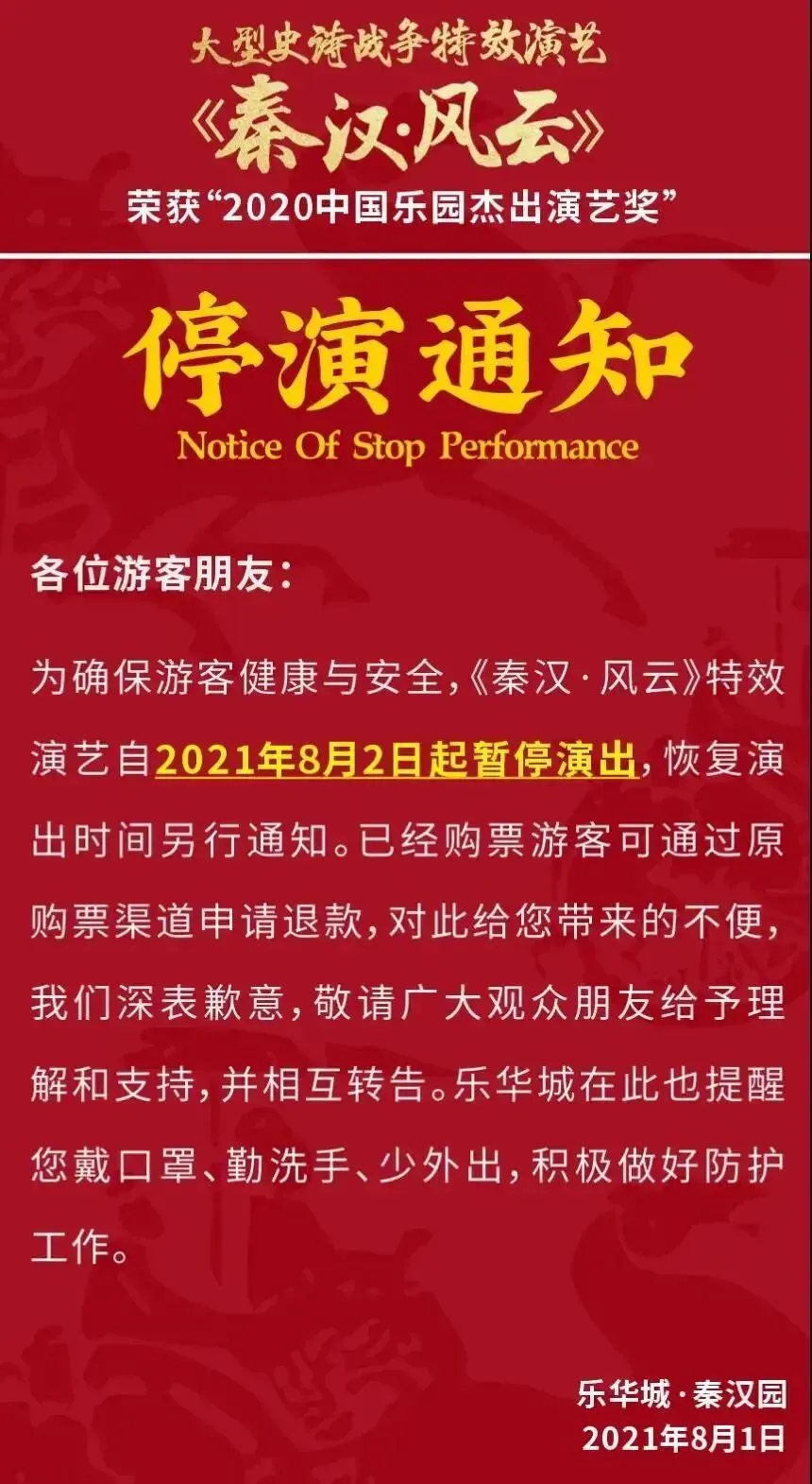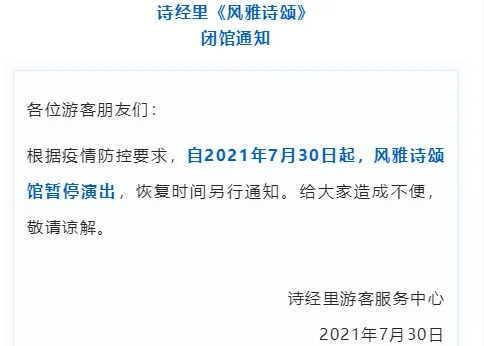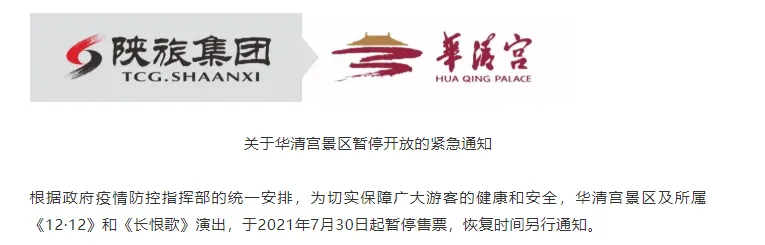 自7月30日12时起,华清宫景区及所属演艺暂停售票,《12·12》和《长恨歌》演出延迟上演,恢复时间另行通知。
