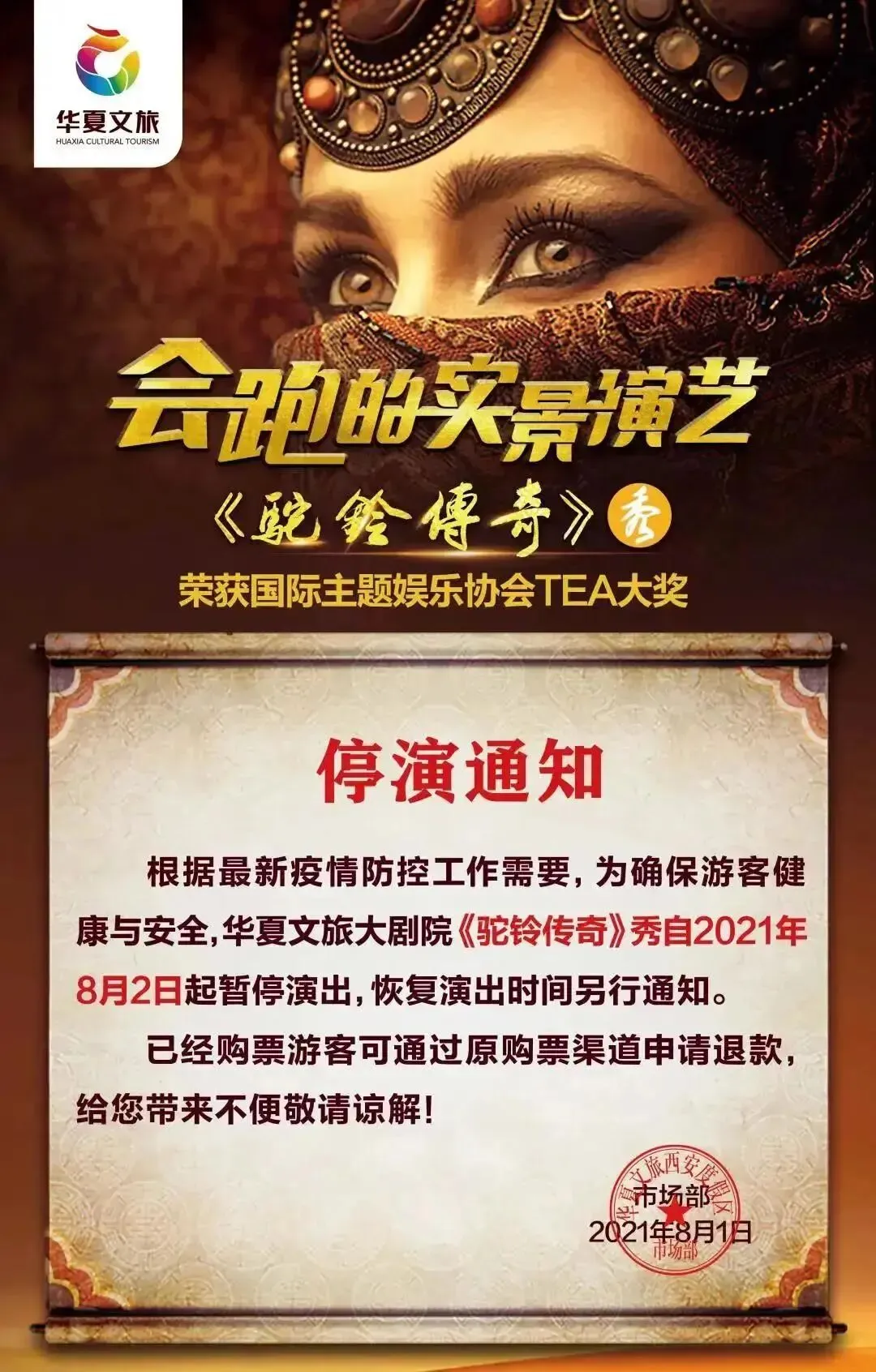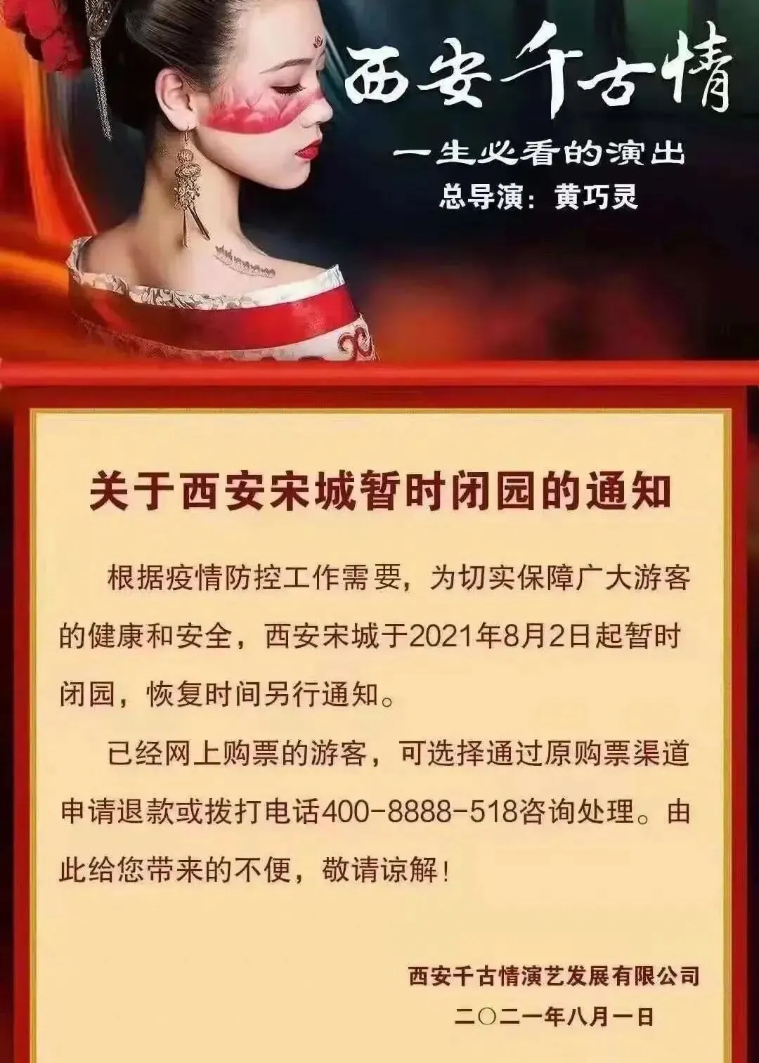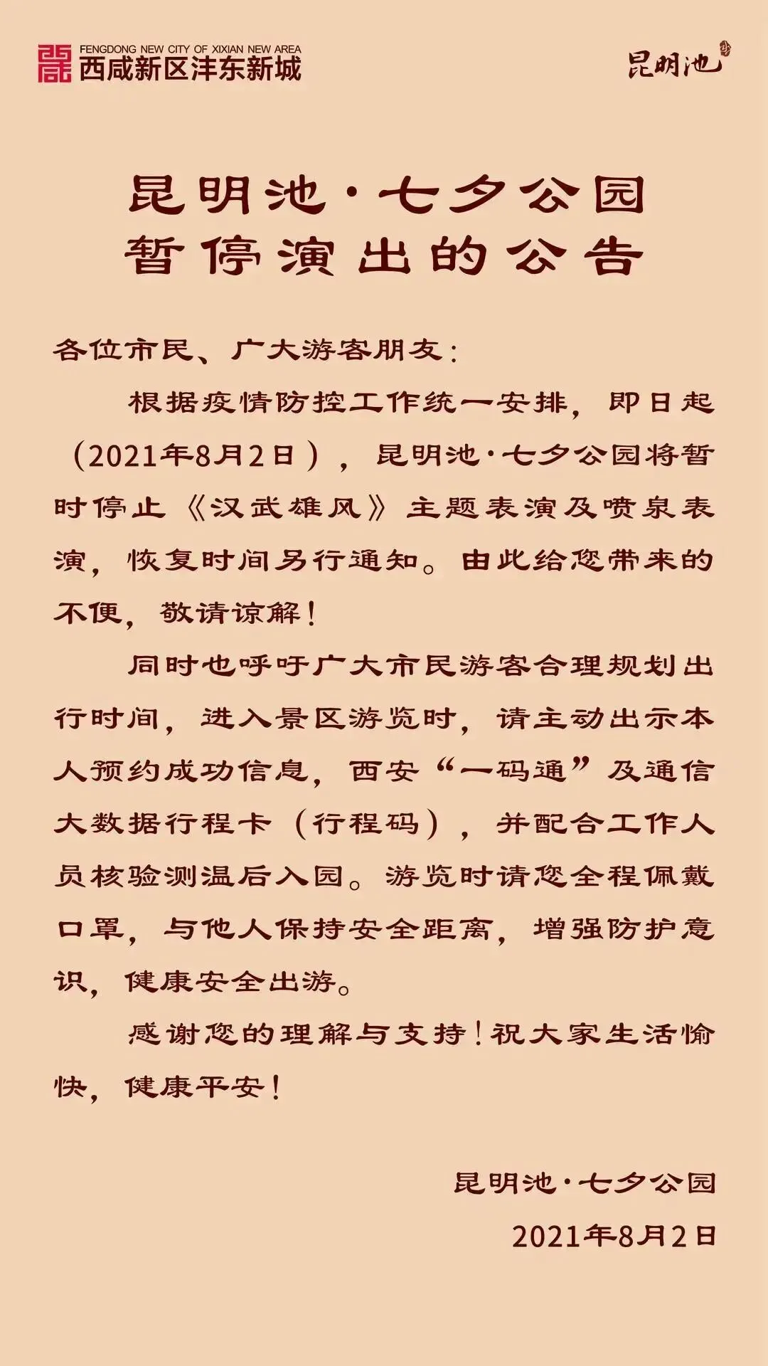 自7月30日12时起,华清宫景区及所属演艺暂停售票,《12·12》和《长恨歌》演出延迟上演,恢复时间另行通知。