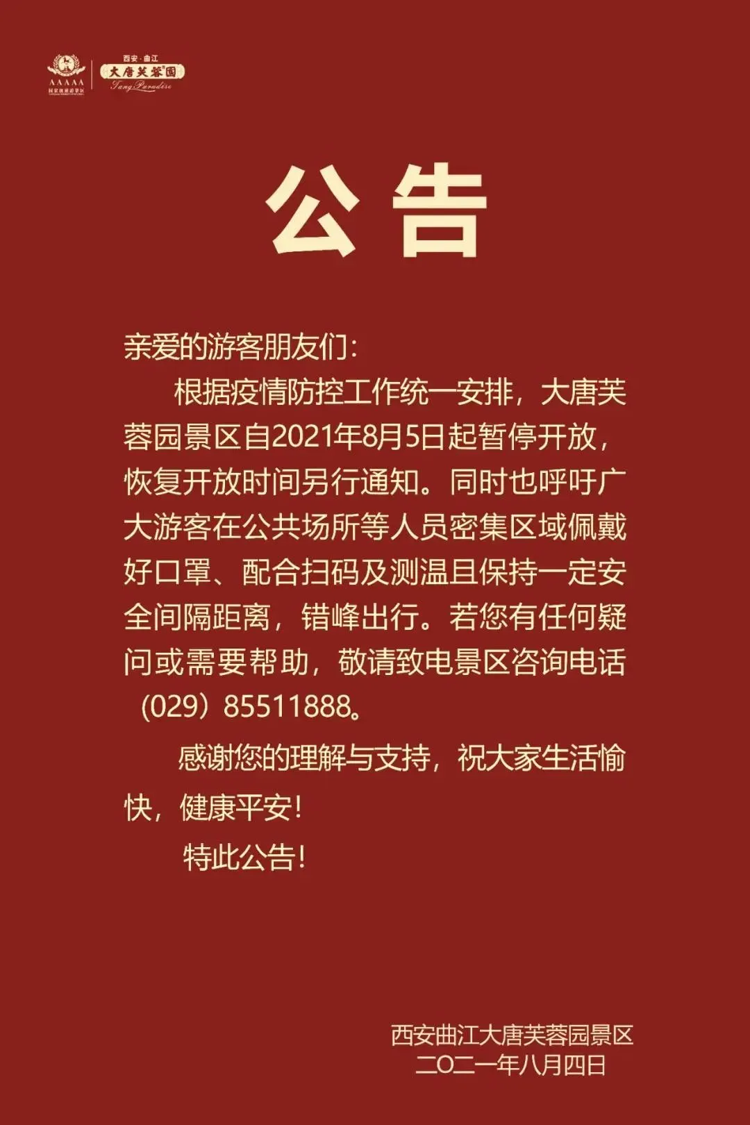 根据疫情防控工作统一安排,大唐芙蓉园景区自2021年8月5日起暂停开放,恢复开放时间另行通知。