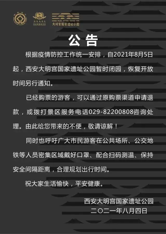 根据疫情防控工作统一安排,自2021年8月5日起,西安大明宫国家遗址公园暂时闭园,恢复开放时间另行通知。